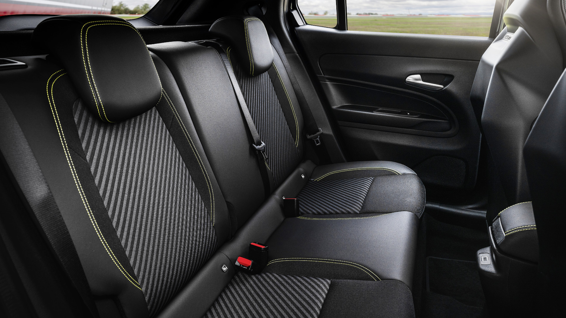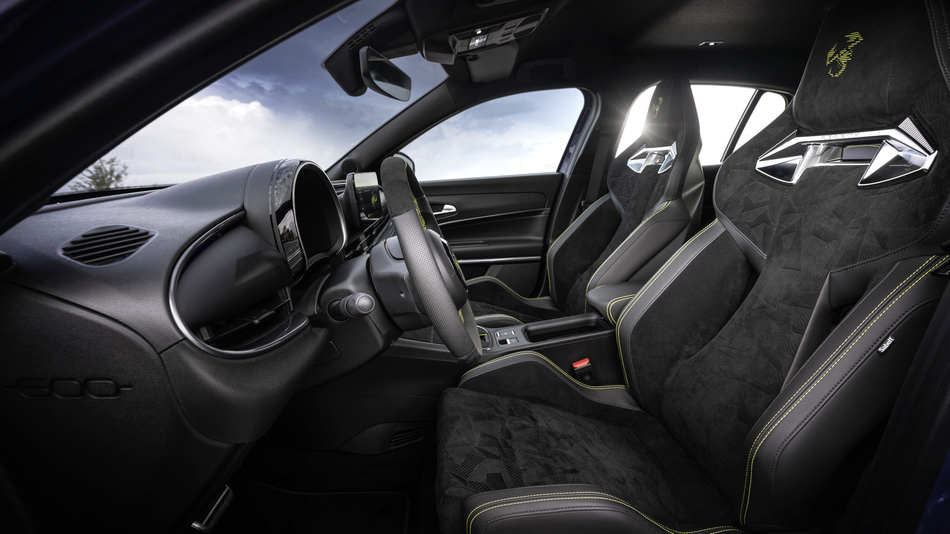 Der Abarth 600e steht den Alltag mit fünf Sitzplätzen, großem Kofferraum und guten Alltagsmanieren: Vier Personen sitzen im 4,19 Meter langen Fünftürer bequem. In der ersten Reihe im 175 kW (240 PS) starken Einstiegsmodell 600e Turismo auf sportiven Integralsitzen von Sabelt und im Topmodell 600e Scorpionissima, das 206 kW (280 PS) an die Vorderräder verschickt, auf Sabelt Rennsportsitzen mit maximal Seitenhalt.