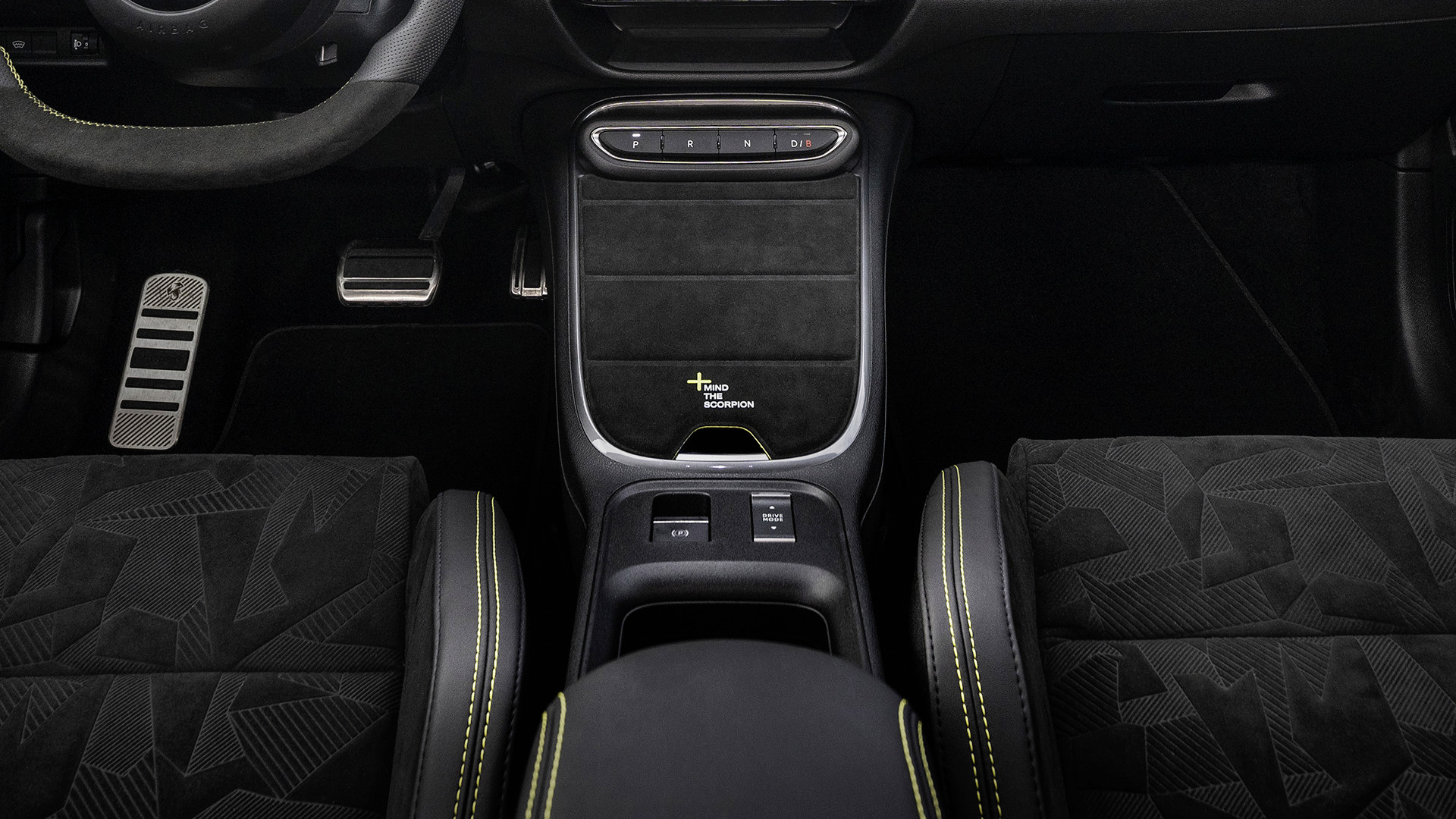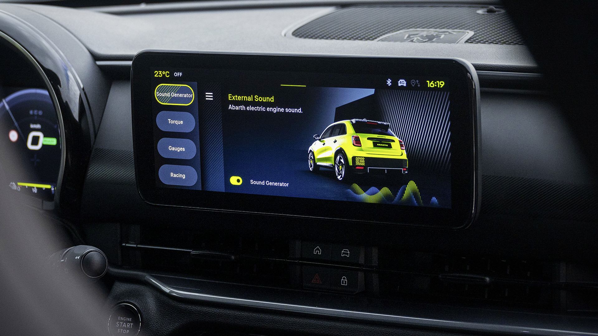 Der zentrale Bildschirm ist der gleiche wie im Fiat, aber über den 10,25-Zoll-Touchscreen lassen sich im Abarth Leistungsdaten wie Drehmoment, Beschleunigungskräfte oder Rundenzeiten abrufen. In beiden Ausstattungsvarianten sind DAB-Radio, sechs Lautsprecher, Android Auto, Apple CarPlay und der USB-A- und C-Anschluss Serie, aber nur im Scorpionissima das Navigationssystem, das kabellose Smartphone-Ladepad und der Soundgenerator.