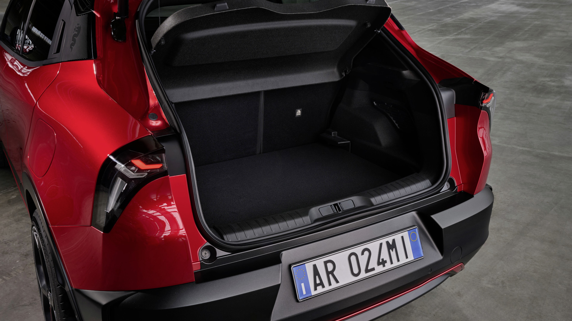 Die Hybrid-Variante des Elettrica kommt auf eine nur unwesentliche größere Kofferraumkapazität. Die Ladekante ist relativ hoch, dafür gibt es aber kein Blech, das beim Einladen verkratzen kann. Der Boden des Kofferraums lässt sich je nach Bedarf in drei Stufen einlegen - ganz oben, ergibt sich ein großer zweiter Ladeboden, ganz unten, die maximale Kofferraumgröße. Mittlere Position: keine Ladekante bei umgelegter Rückbank. Die fällt im Verhältnis ⅓ zu ⅔, eine Durchreiche für Skier gibt es nicht. Eine Fernentriegelung vom Kofferraum auch nicht, ist bei der Kürze des Alfa Romeo Junior auch kein Problem, die Riegel an der Oberseite der Sitze sind vom Heck aus gut zu erreichen. An den Seiten links und rechts sichern kleine Haken die Einkaufstaschen vorm Herumrutschen im Kofferraum. Vorne gibt es einen Frunk, um die Ladekabel unterzubringen.