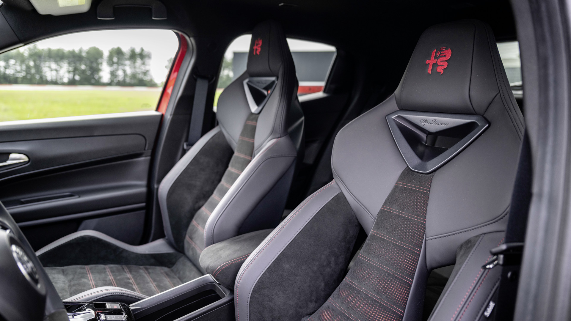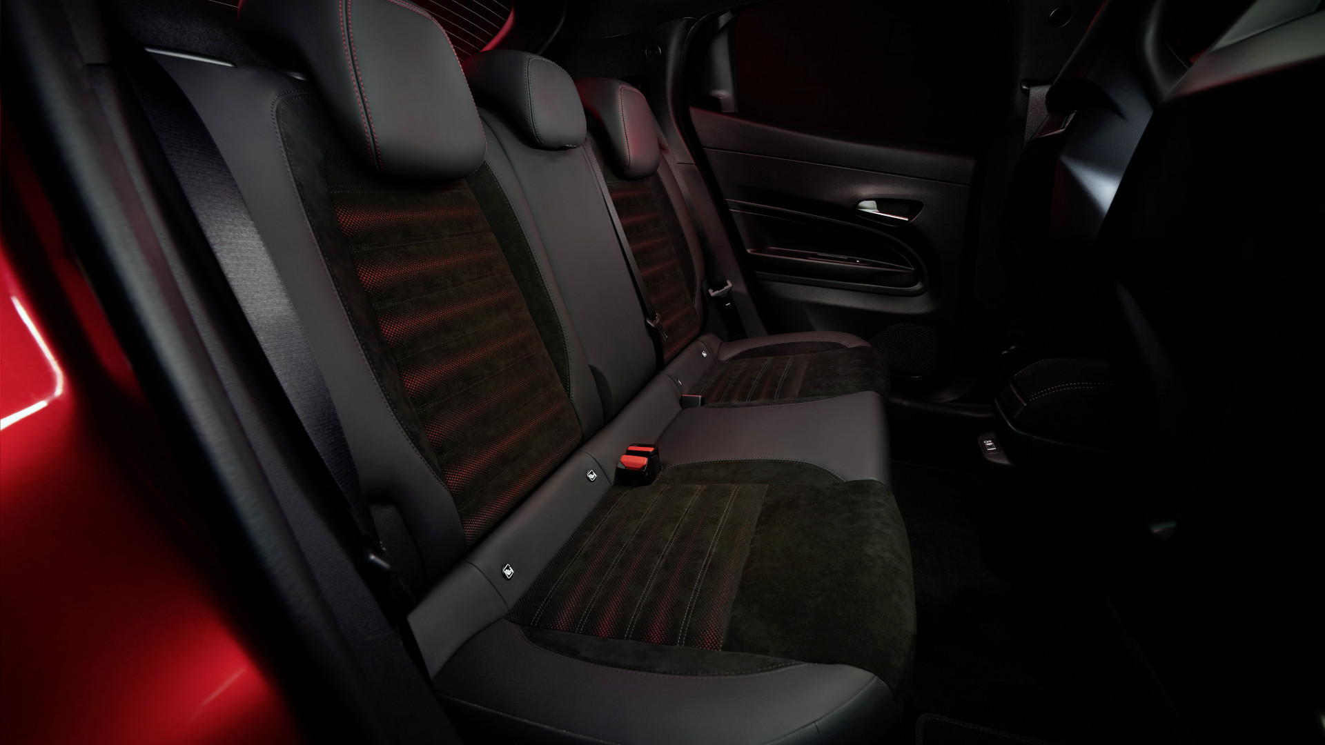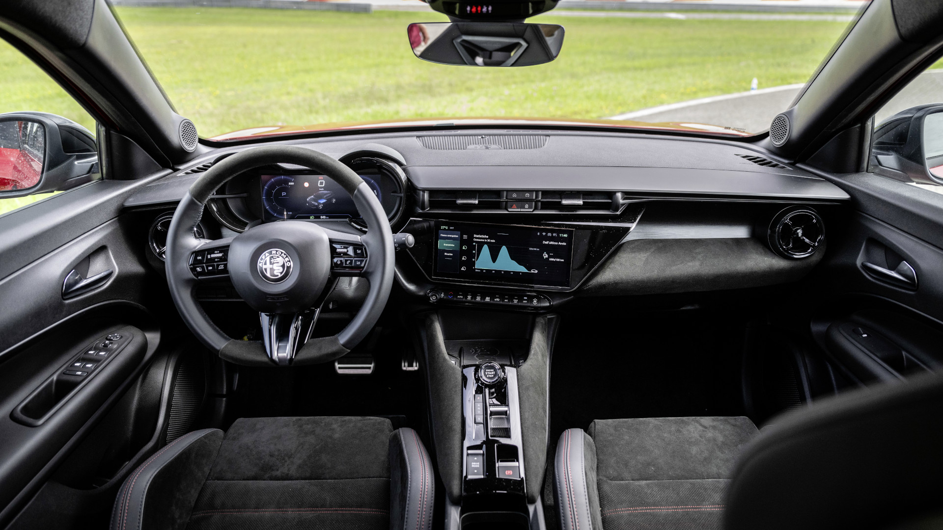 Auf jeden Fall ist es Alfa Romeo gelungen, sich mit dem Interieur von den anderen Stellantis-Marken abzusetzen. Im Basismodell sind Armlehne, Armaturenbrett, Mittelkonsole und Mittelarmlehne mit dunkelblauem Kunstleder überzogen, die Sitze mit Stoff. In „Speciale“ und „Veloce“ wird aus dunkelblau anthrazit und es gibt ein Lederlenkrad, Aluminiumpedale und eine Ambientebeleuchtung in acht Farben. Die Verarbeitung ist gut, bei näherem Hinsehen sind aber einige ziemlich schlichte Kunststoffe verbaut, die dem Preis des Juniors nicht gerecht werden. Ein Ausstattungstipp sind die Sportsitze, die extrem guten Halt bieten und durch ihre strahlenförmigen Durchlässe nach hinten (Stichwort: extra Kniefreiheit im Fond) dem Alfa einen extravaganten Touch verpassen.