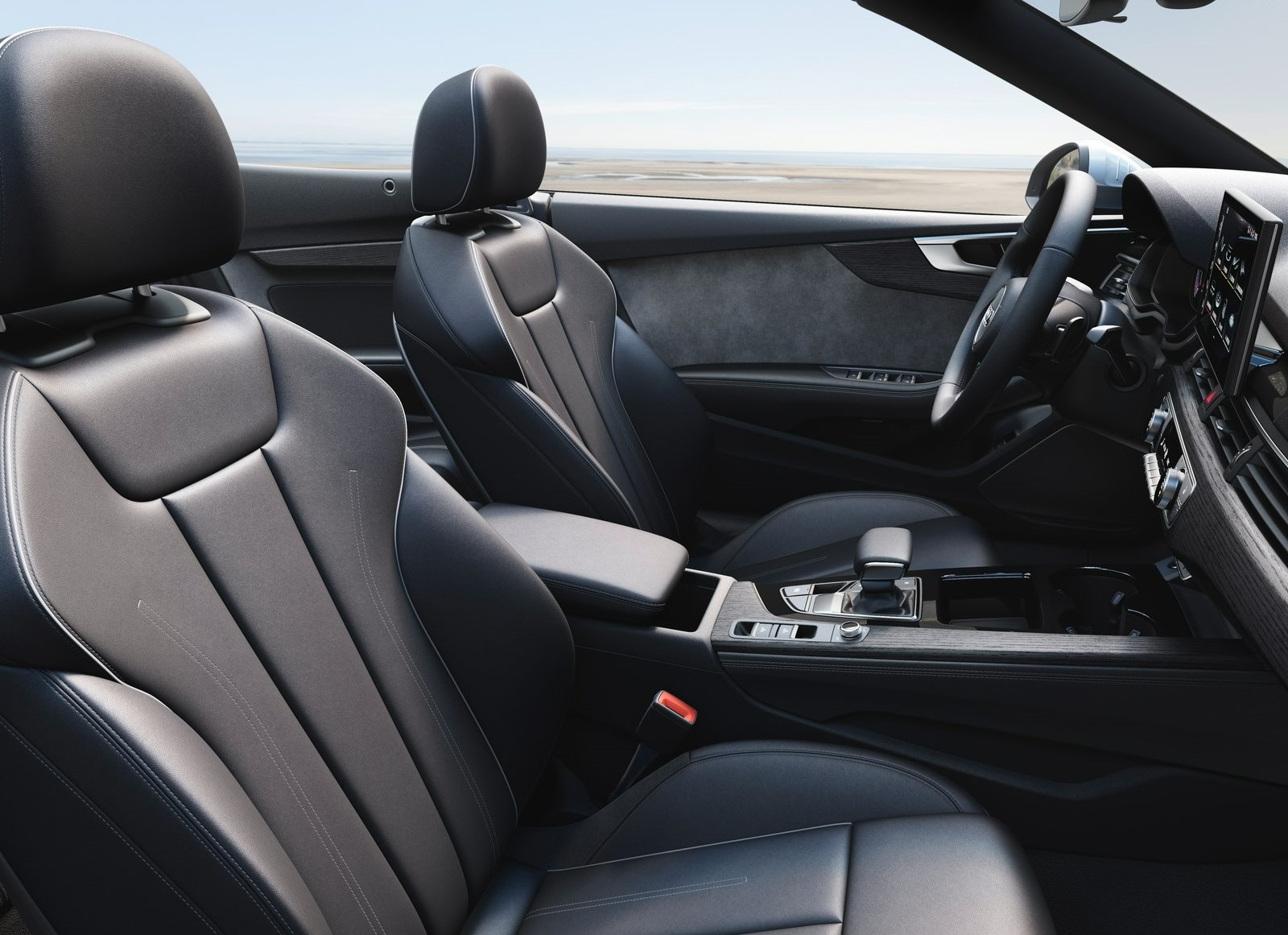 Im Innenraum und in der Komfort- und Sicherheitsausstattung orientiert sich das A5 Cabrio am A5 Coupé. Das Cockpit mit dem durchgängigen Luftdüsenband und dem frei stehenden Bildschirm ist ebenso identisch wie das brillante Instrumentarium und die Schalter – bis auf den Schalter des Cabriodachs. Eine weitere Gemeinsamkeit eint A5 Cabrio und A5 Coupé: die nicht enden wollende Liste an Extras.