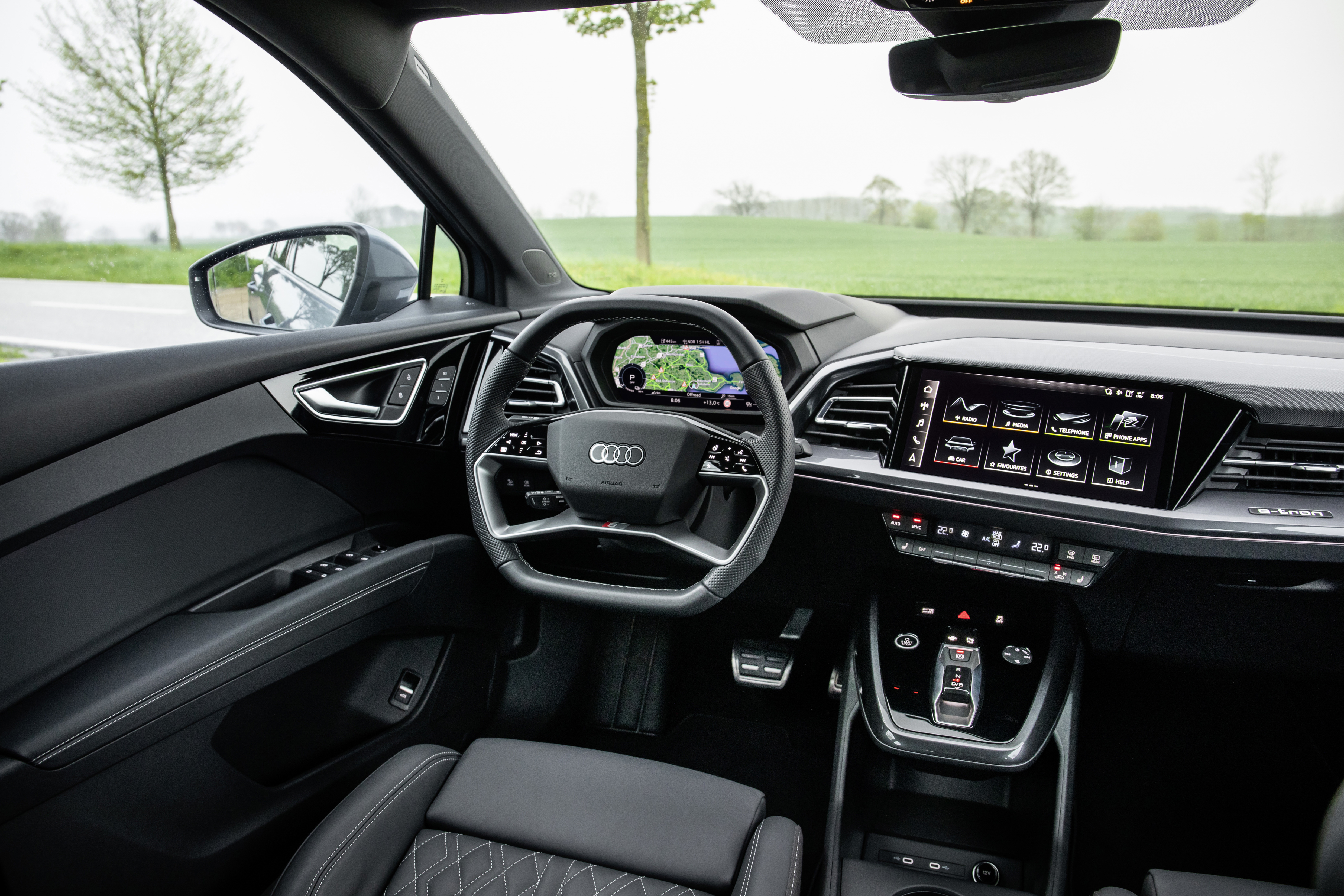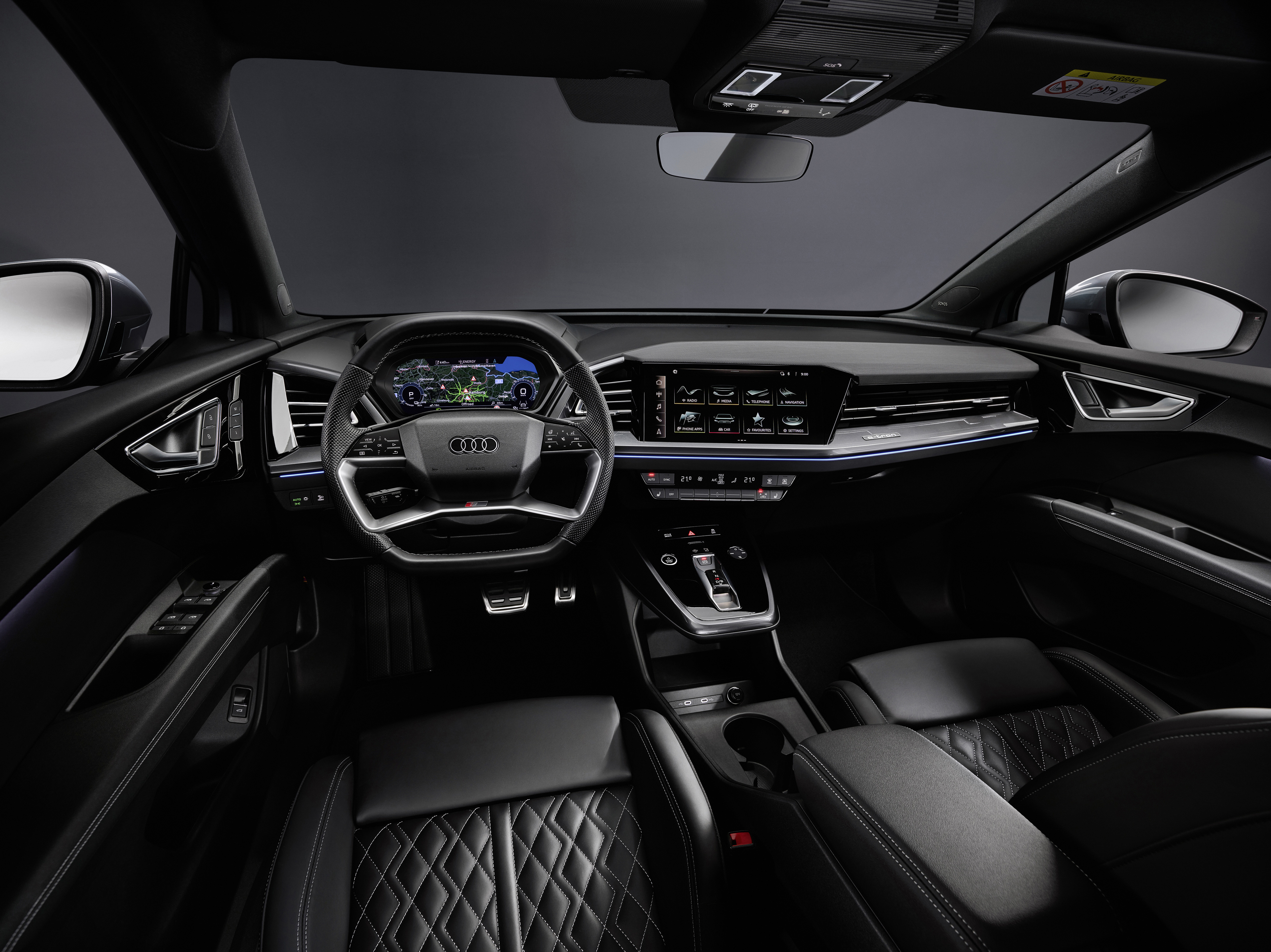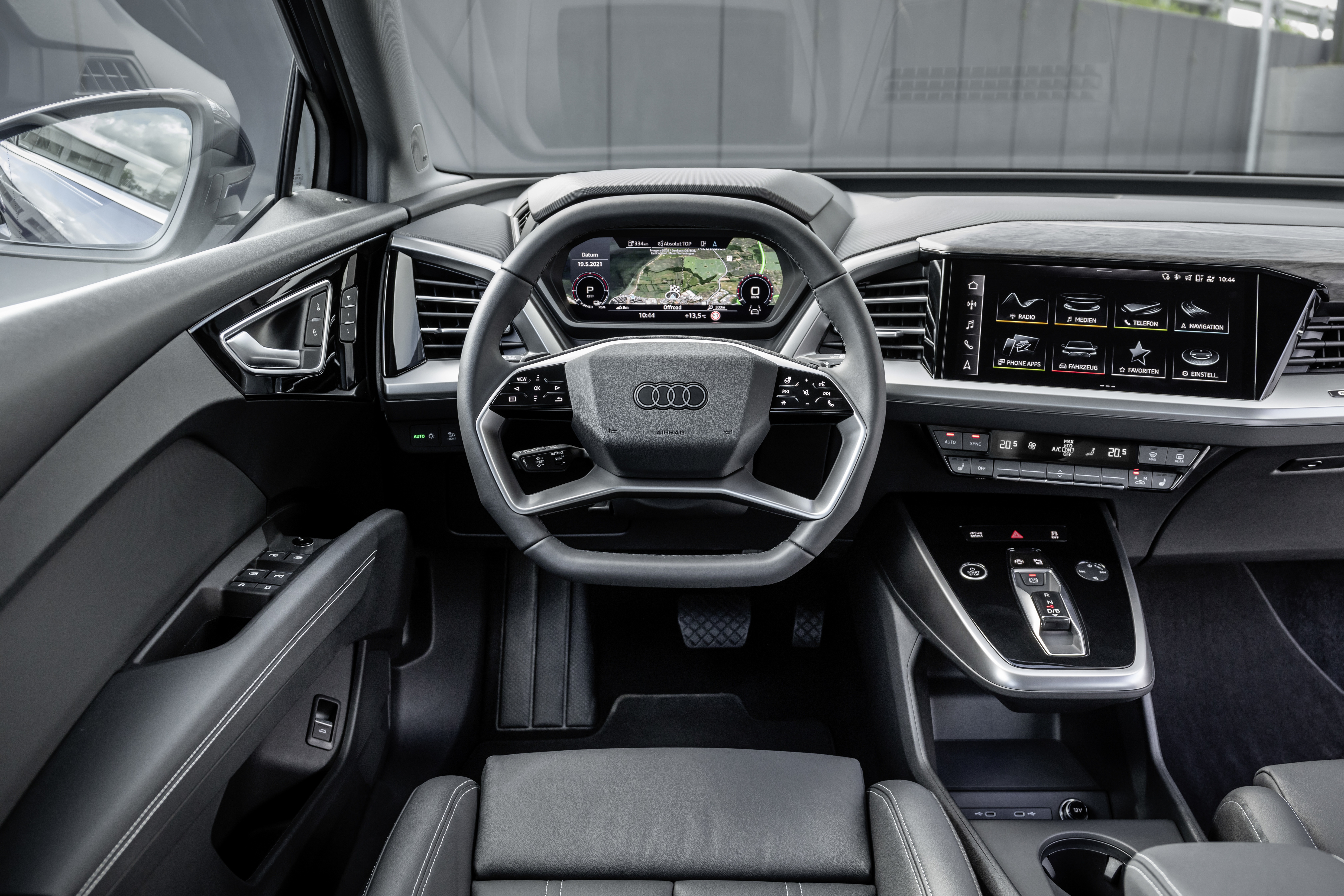Der Audi Q4 e-tron kann mit einer hochwertigen Innenausstattung in Premiumqualität punkten. Die gewählten Materialien sind optisch wie auch haptisch ansprechend. Das Cockpit überzeugt mit einer aufgeräumten Optik und trotzdem sind wichtige Funktionen einfach und intuitiv zu bedienen. Besonders gefällig ist, wie sehr sich die Bedienelemente in Richtung Fahrsitz neigen. Nicht nur der zentrale Display, sondern auch die Tasten darunter sind leicht in Richtung Fahrende gerichtet.