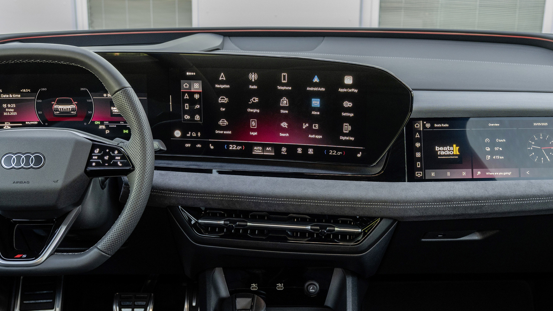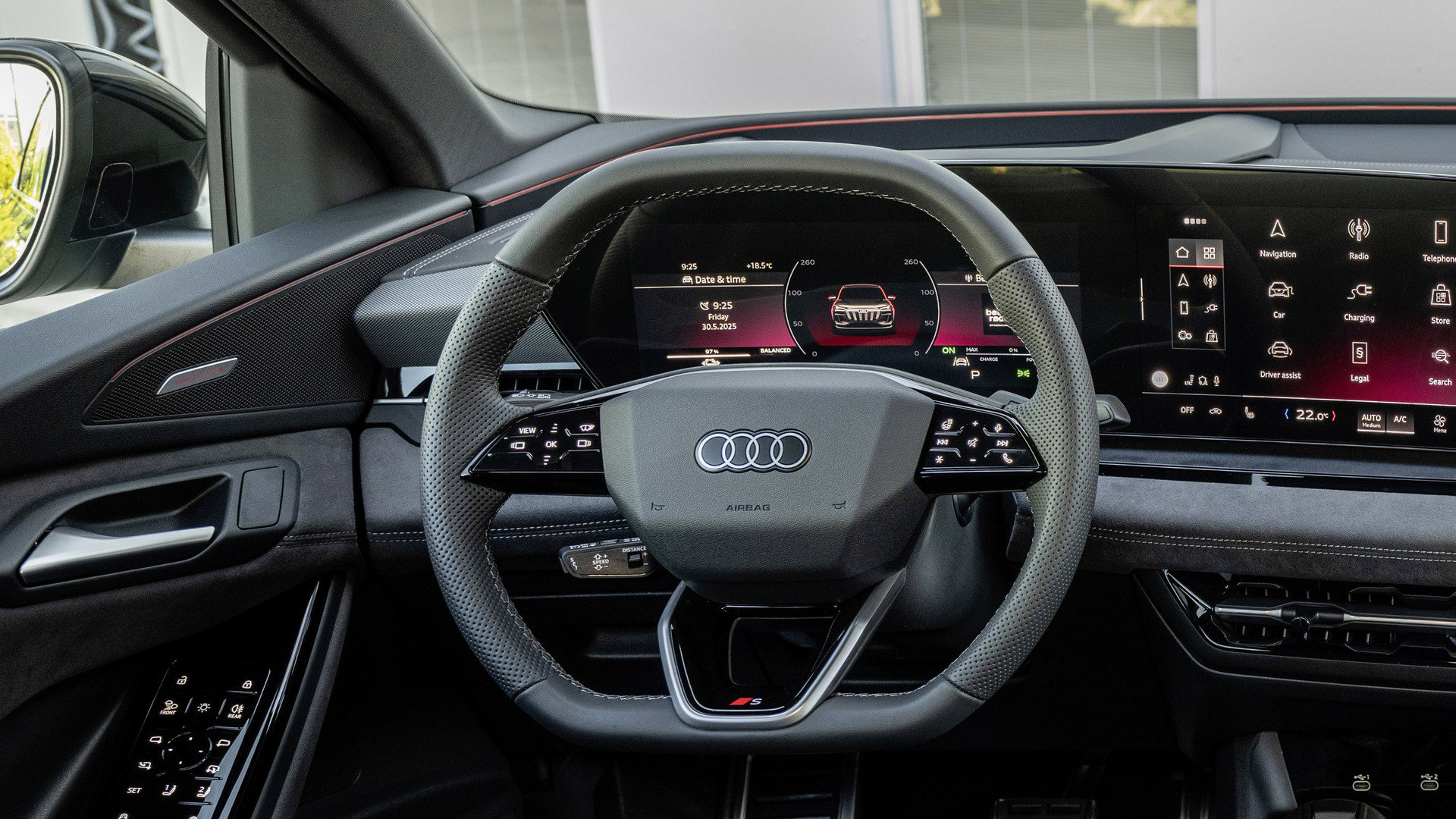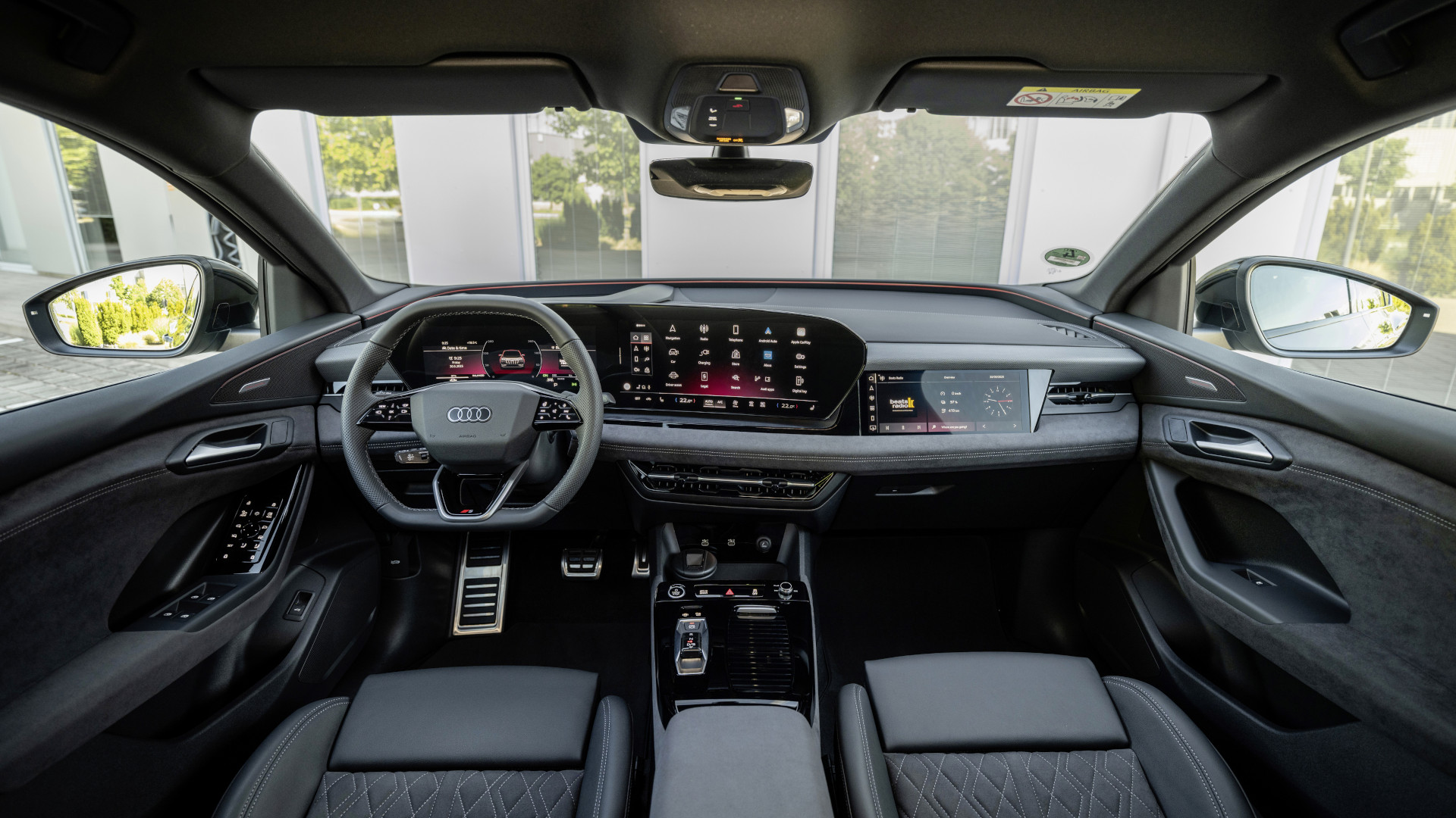 Im Innenraum zeigt sich Audi von seiner besten Seite. Hochwertige Materialien, saubere Spaltmaße, Leder, gebürstetes Aluminium und feine Dekoreinlagen prägen das Interieur. Das Cockpit ist ergonomisch durchdacht: Alle Bedienelemente sind logisch angeordnet, die Sitzposition hoch und die Rundumsicht hervorragend. Die dualen Displays, ein 11,6-Zoll-Touchscreen für Infotainment und ein 12,3-Zoll-Digitaldisplay für Instrumente, sind hochauflösend, intuitiv bedienbar und reagieren flüssig auf Eingaben. Die höheren Ausstattungslinien bieten zusätzliche Features wie ein Head-up-Display mit Augmented Reality, erweiterte Navigationsoptionen, ein besseres Soundsystem und eine umfassende Ambientebeleuchtung.