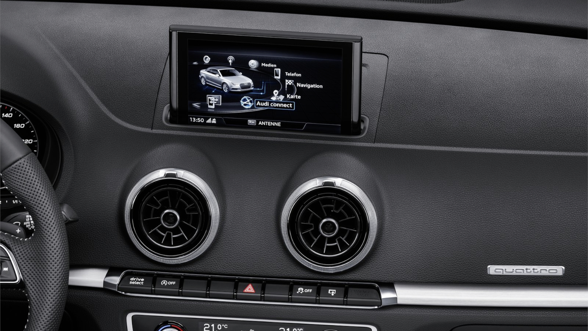 Die auf Wunsch erhältliche MMI Navigation und die MMI Navigation plus mit MMI touch bringen in Verbindung mit dem Baustein Audi connect viele Online-Funktionen ins S3 Cabrio. Die Datenübertragung erfolgt mit dem schnellen LTE-Standard. Die dafür benötigte Daten-Flatrate ist dank der fest im Fahrzeug verbauten SIM-Karte inklusive.