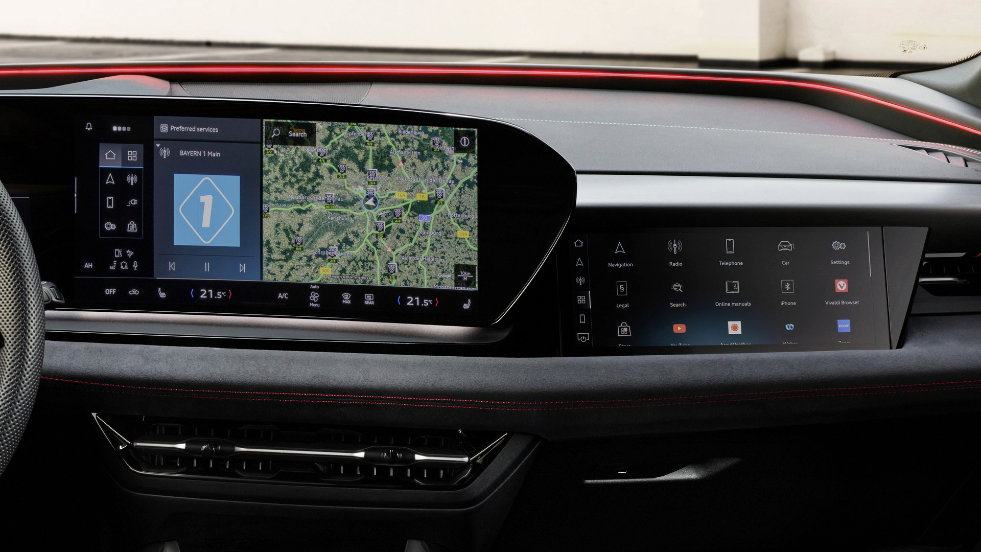 Der Innenraum ist irgendwie typisch Audi, zeigt aber auch, wo es in Zukunft hingeht: Wer den Minimalismus von Tesla schätzt, bekommt hier das Gegenteil: Eine breite Displayleiste zieht sich über die Armaturen, gegen Aufpreis gibt es ein drittes, nur für die Beifahrenden. Über dessen Sinn und Unsinn lässt sich streiten, klar ist aber, dass so viel Information erst einmal verarbeitet werden muss. Denn zu den drei Bildschirmen gesellt sich noch ein großes Head-up-Display. Jedes dieser Features für sich genommen ist hervorragend, alle zusammen erst einmal gewöhnungsbedürftig. Zumal es im ansonsten makellosen Innenraum einige Materialien gibt, die in dieser Preisklasse eigentlich nichts zu suchen haben. Dem Sparzwang im Automobilbau sei Dank finden sie sich aber heute bei allen selbsternannten Premium-Herstellern.