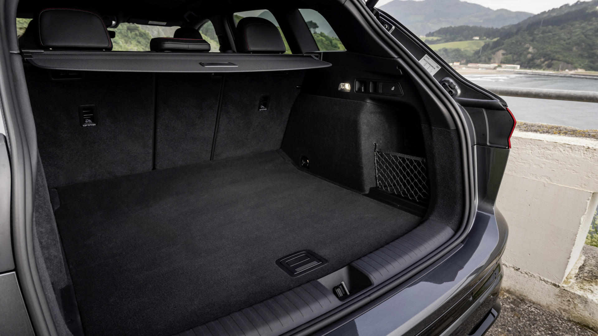 Der Audi SQ6 e-tron ist 4,77 Meter lang und kommt auf eine Breite von bis zu 1,97 Meter. Die Seitenspiegel mit eingerechnet sind es sogar fast 2,20 Meter. Die maximale Höhe beträgt 1,70 Meter. Unterschiede zu den anderen Modellen des Q6 e-tron gibt es nicht, bis auf die Kofferraumkapazität. Der Audi SQ6 e-tron ist die Variante der Baureihe mit dem kleinsten Ladevolumen. 514 bis 1.517 Liter sind es, in den anderen Modellen stehen 525 bis 1.529 Liter zur Verfügung. Die Sitze klappen im Verhältnis ⅓ zu ⅔ um. Das geschieht praktischerweise per Fernentriegelung vom Kofferraum aus. Die Fläche ist dann fast ebenerdig und reicht, um beispielsweise ein Fahrrad zu transportieren. Der Mittelteil der Rücklehne kann auch einzeln umgelegt werden.