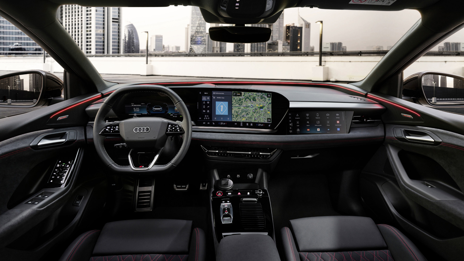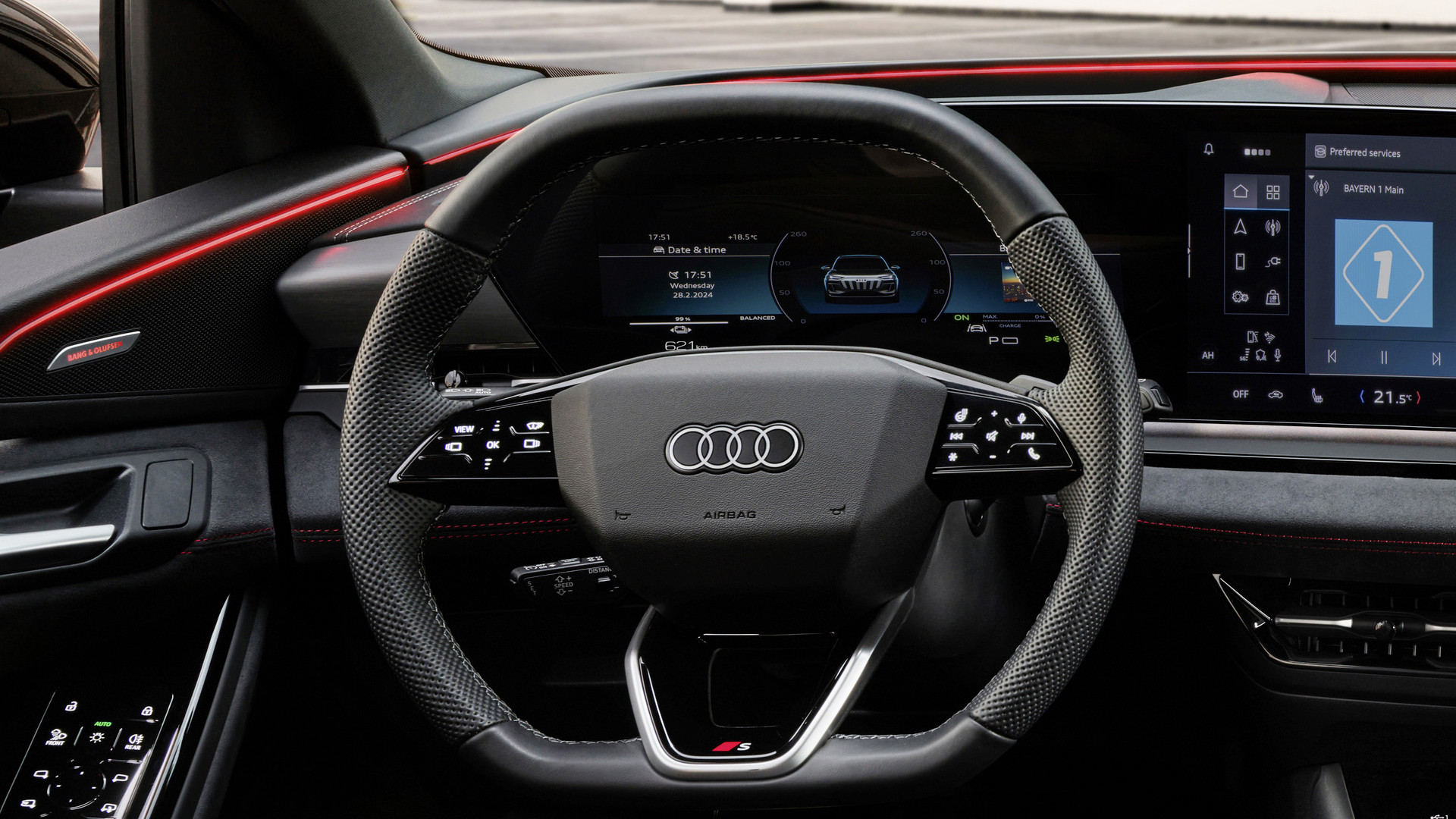 Beim ersten Einsteigen zeigt sich im Interieur die gewohnte Audi-Qualität. Alles ist sauber verarbeitet und die Spaltmaße stimmen. Der neue Look wirkt aufgeräumter, bietet aber viel von allem: viele Zierelemente, viele Bildschirme. Der Hauptunterschied zu den normalen Modellen des Q6 e-tron sind die immer wieder roten und silbernen Aufblitzer mit dem S-Logo in der Innenausstattung. Wer genauer hinsieht, entdeckt einige sehr robust wirkende Kunststoffteile, wie etwa an den Türen, die mittlerweile leider auch in dieser Preisklasse Standard sind. Der Rest fasst sich besser an: Seien es die weichen Kunststoffe auf der Oberseite der Armatur oder die Überzüge aus Mikrofaser.