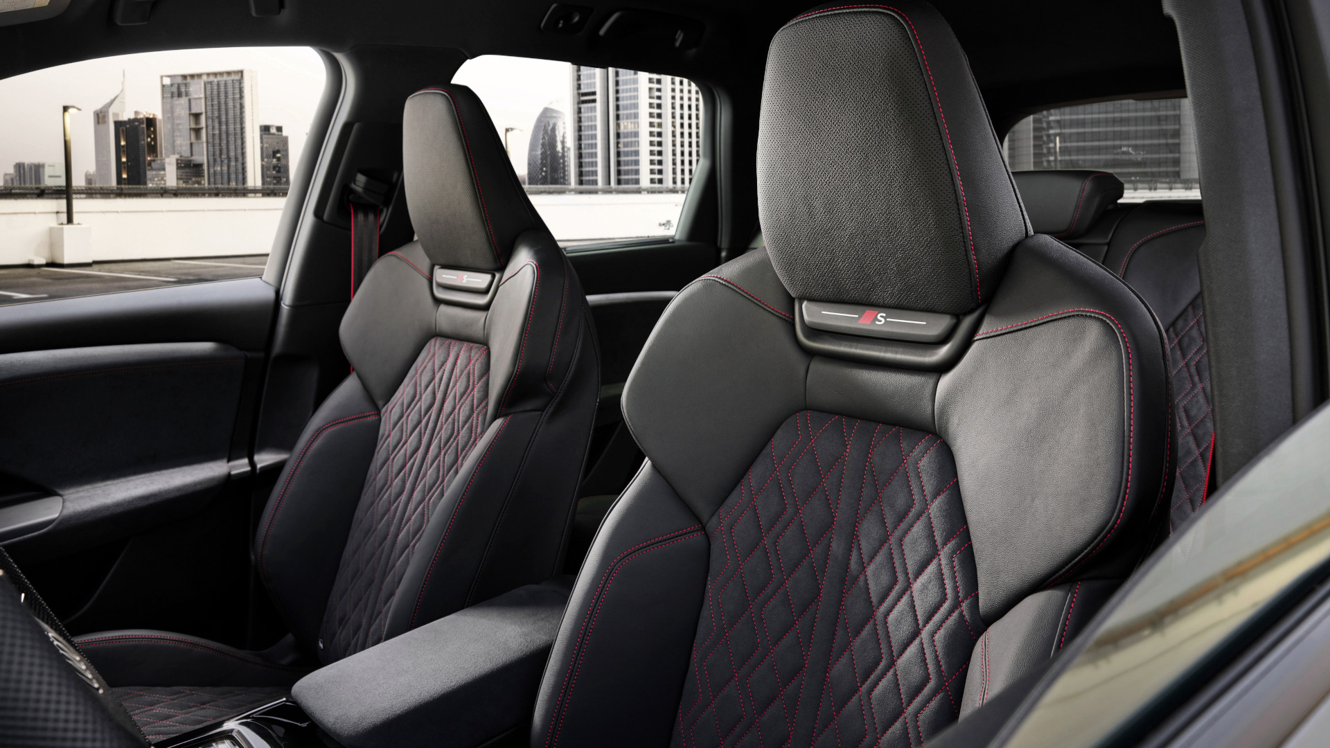 Wie bei deutschen Herstellern üblich, ist die Ausstattungsliste für den Innenraum schier endlos. Das beginnt bei den Sitzen des SQ6 e-tron. Serie sind Sportsitze mit manuell ausziehbarer Oberschenkelauflage, Aufpreis kosten die Sportsitze plus mit manuell einstellbarer Gurthöhe und Dekorblende mit S-Emblem. Die Farben? Schwarz, Grau, Rot und noch einmal Schwarz, in Kombinationen aus Leder, Kunstleder und Mikrofaser. Ganz tierfrei gibt es das Interieur des Audi SQ6 e-tron nicht, in dieser Preisklasse bei Elektroautos mittlerweile eine Ausnahme.