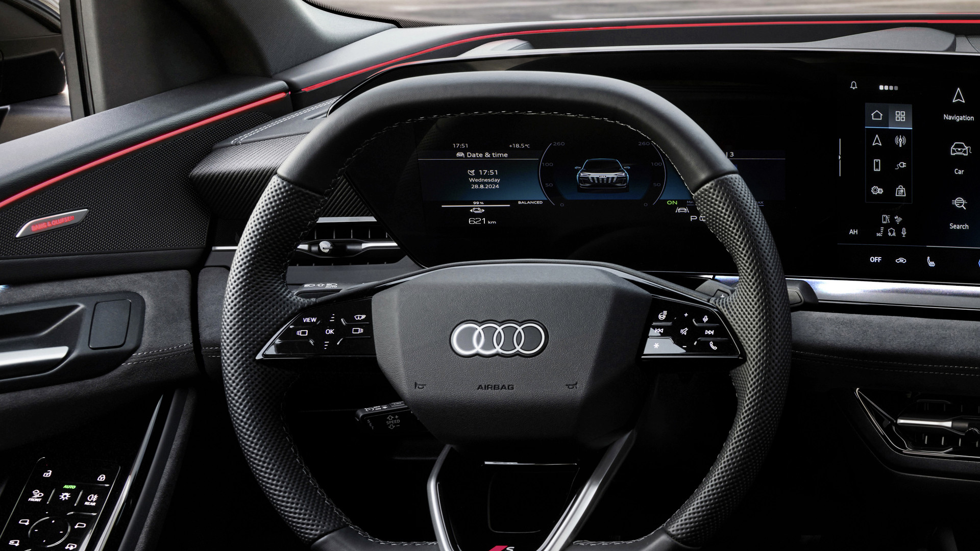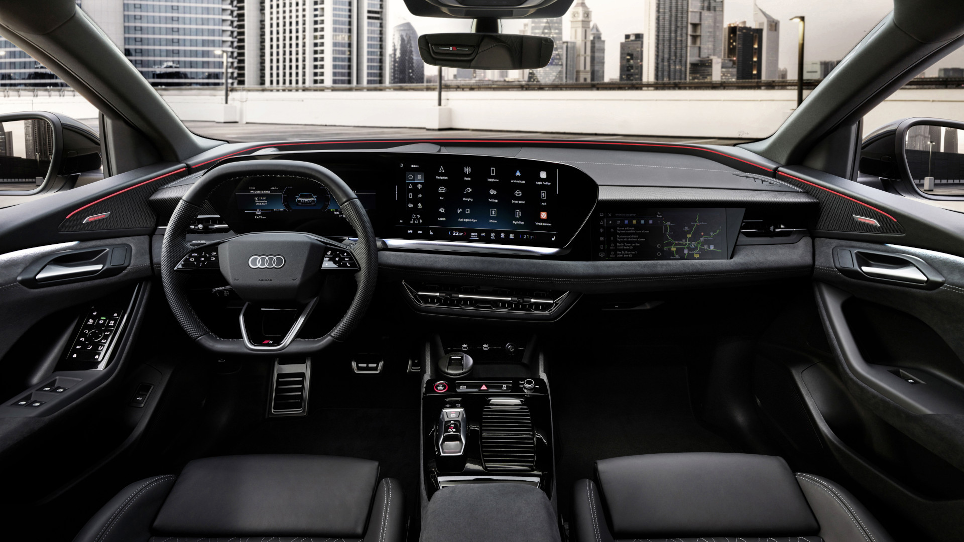 Sein Cockpit und Infotainment verdankt der Audi SQ6 Sportback ebenfalls der neuen Plattform. Wie im Audi Q6 e-tron und im Audi A6 e-tron spannt sich eine eindrucksvolle volldigitale Displaylandschaft in einem sanften Bogen um den Fahrerplatz, der bis vor den Beifahrerplatz reichen kann, wenn man dafür extra investiert.