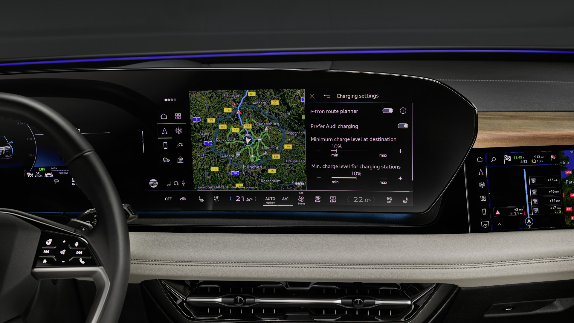Mit Praxisreichweiten um die 400 km sollte man im Audi SQ6 Sportback e-tron kalkulieren, bevor das Aufladen ansteht. Das Laden geht äußerst flott vonstatten. Es ist zwar etwas schade, dass 300-kW-Ladesäulen im Ladeplaner ausgespart werden und der SQ6 zum Marktstart mit Wechselstrom (AC) nur mit 11 kW lädt (die Option auf 22 kW folgt), aber mit dem 800-Volt-System ist die Batterie flott gefüllt. Mit einer Ladeleistung von 270 kW in nur 21 Minuten von 10 auf 80 Prozent. Damit ist die Ladedauer genauso flott wie im Porsche Macan Electric und flotter als in einigen Konkurrenz-SUVs, die noch auf 400 Volt setzen.