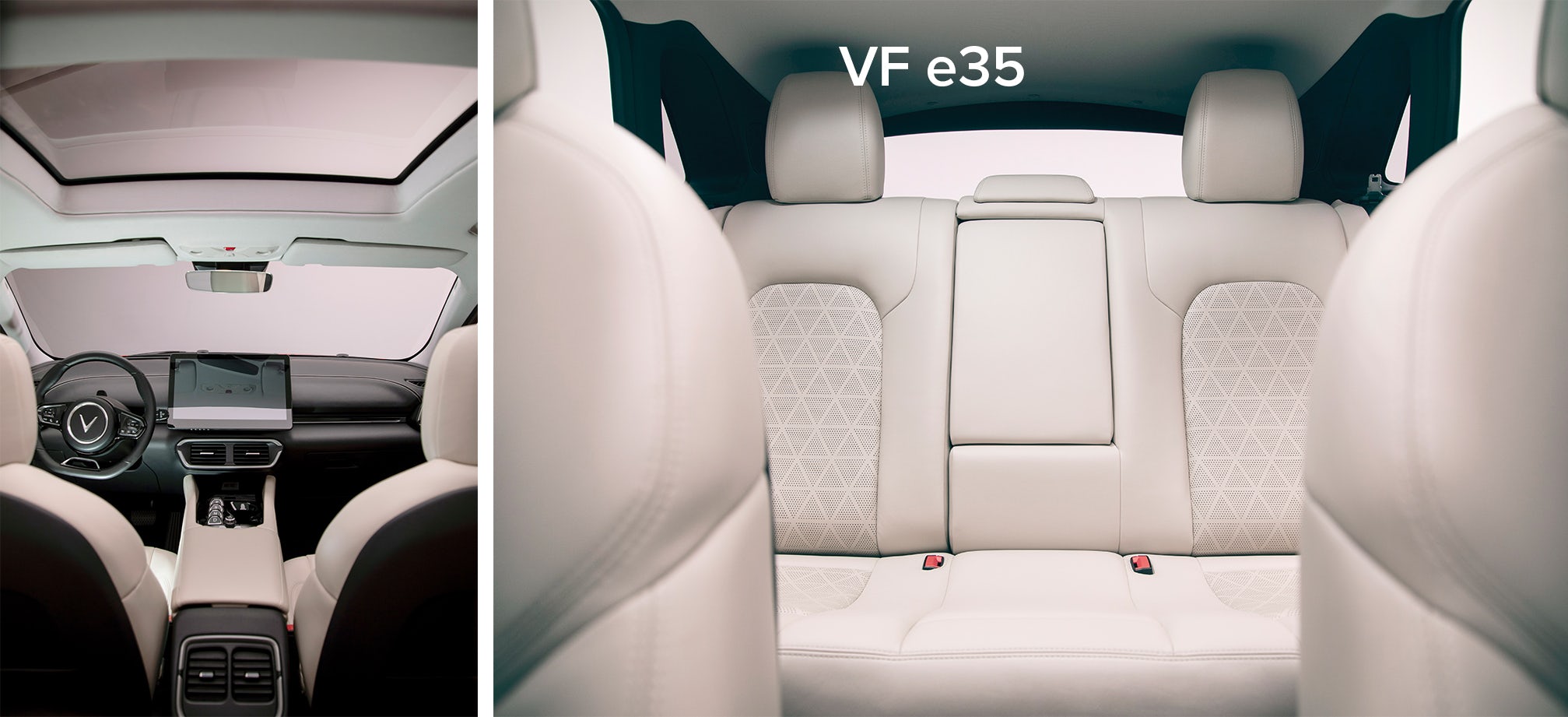 Im Inneren des VF 8 (e35) erwartet Sie ein edles, reduziertes aber hochwertig wirkendes Interieur. Dominierend sitzt der Touchdisplay mittig des Armaturenbretts. Die Sitze sind mit einem Materialmix versehen und mit Stickungen verziert. Insgesamt macht es den Eindruck, als ob man im VF 8 nur noch wenige manuell zu bedienende Tasten findet.