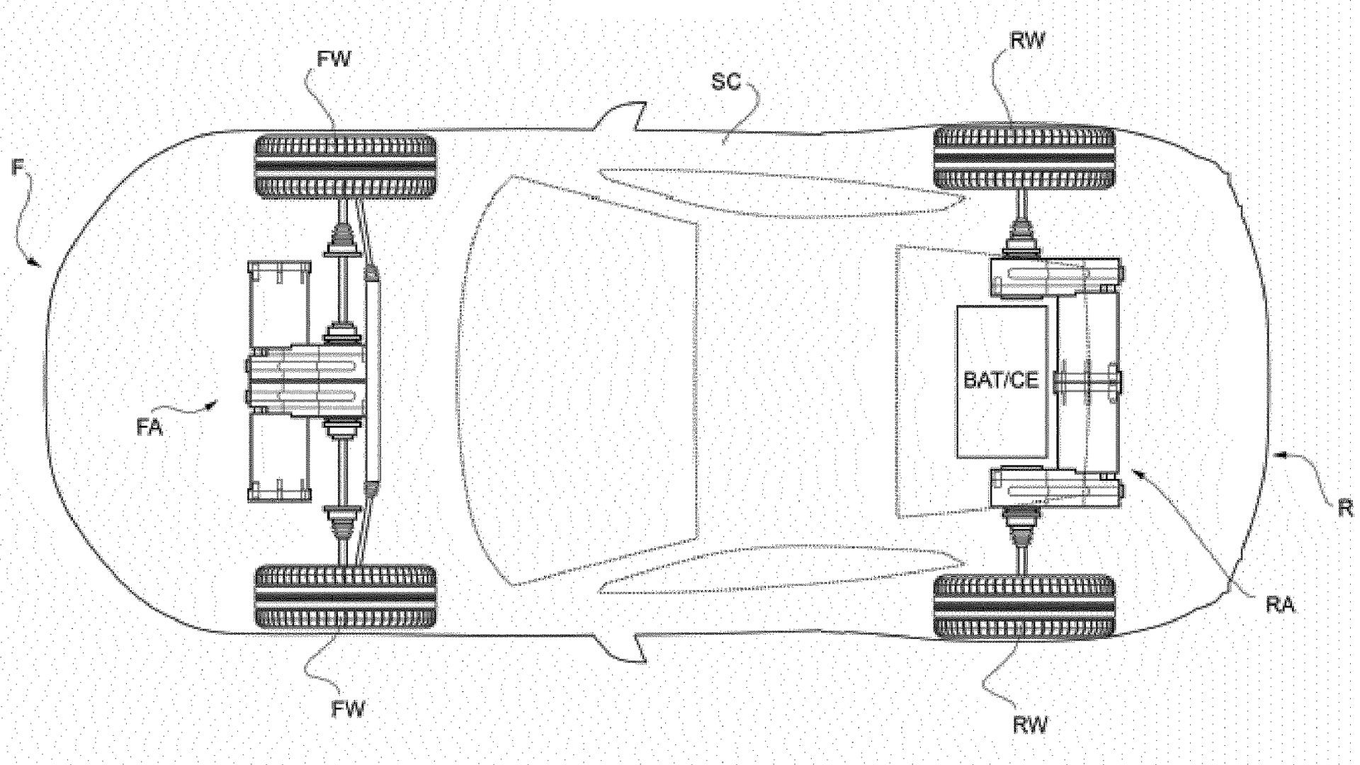 Ein weiteres Patentbild (unten) zeigt ein Elektroauto mit vier Elektromotoren aus der Vogelperspektive.