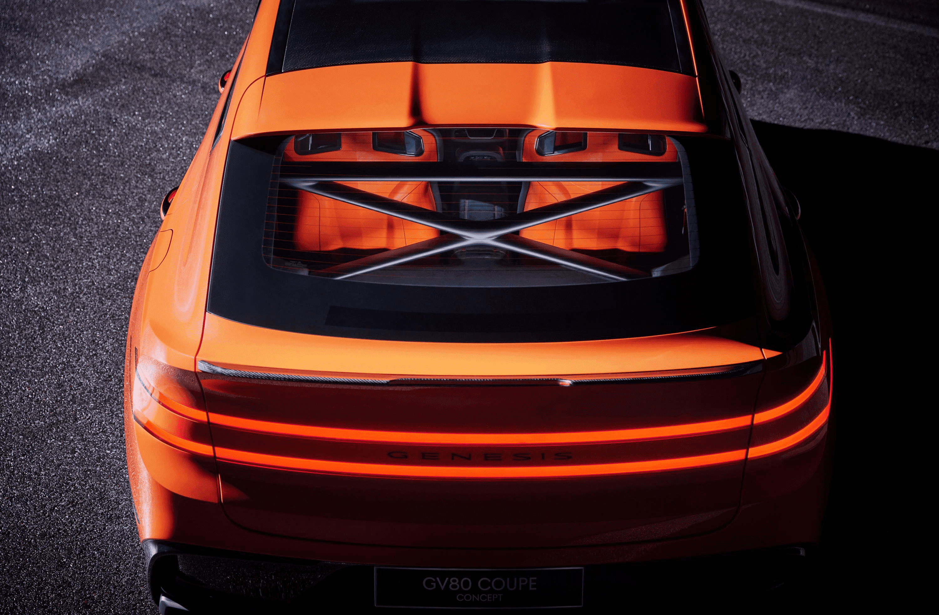 Damit Insassinnen und Insassen des Genesis GV80 Sportcoupé Konzept auch auf flotteren Fahrten nicht aus den Stühlen fliegen, verbaut der südkoreanische Autohersteller sportliche Schalensitze mit optimalem Seitenhalt. Wer im Wagen sitzend nach hinten blickt, wird nicht um den Anblick der hinter der Sitzreihe angesiedelten G-Matrix-Federbeinstrebe herumkommen. Diese optimiert die strukturelle Steifigkeit der Karosserie und sorgt für den gewissen Wow-Effekt beim Einstieg in das viersitzige Coupé-SUV.