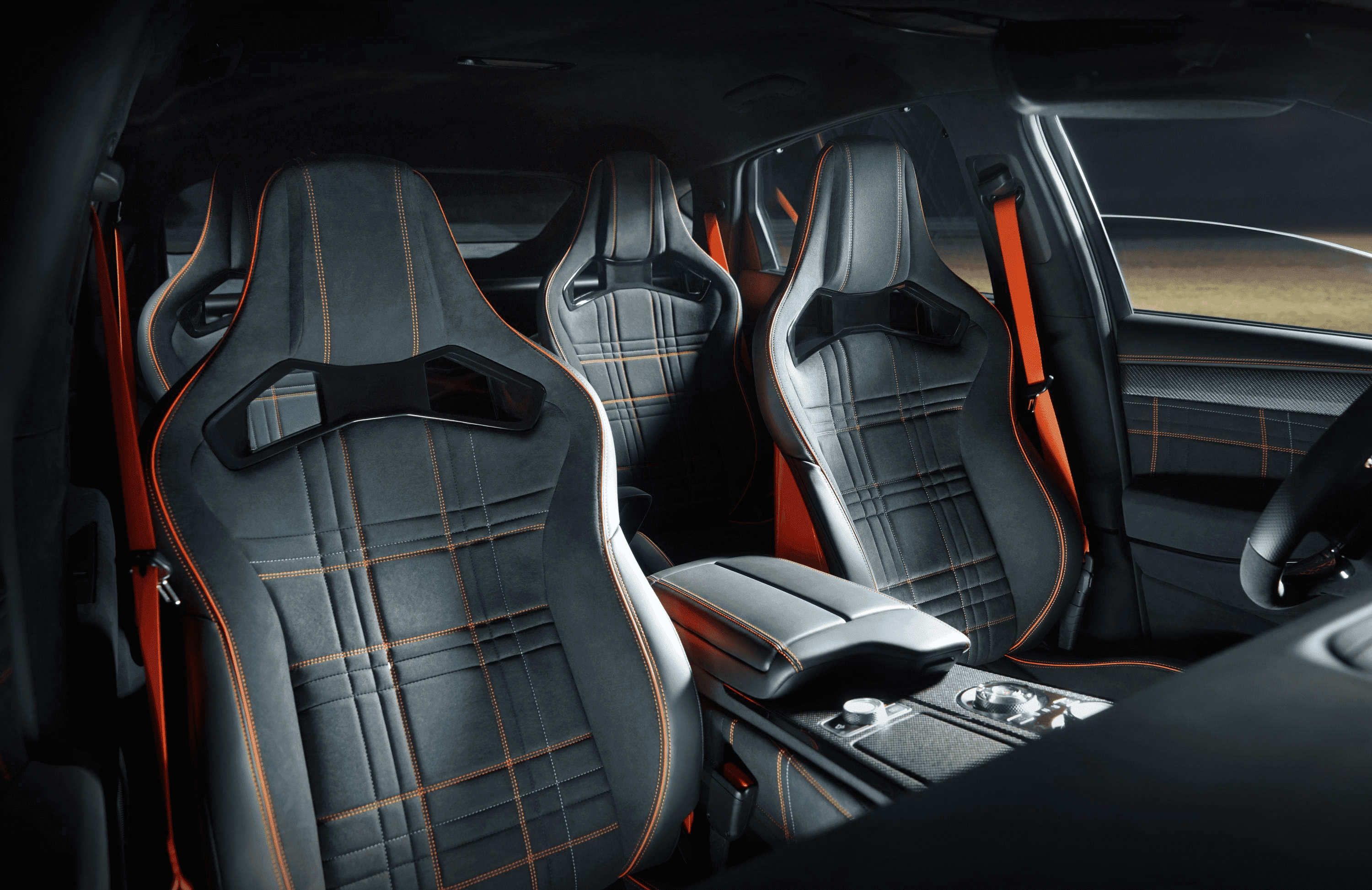 Bilder vom Innenraum sind nur aus der Studie bekannt. Was außen begann, setzt sich innen fort: Die Farbgebung Magma zieht sich wie ein Motto in Form von Ziernähten und Karbonfasern durch das Interieur. Gesäß, Rücken und Hände werden an Sitzen und Lenkrad mit Nappa- und Veloursläder nach allen Regeln der Kunst verwöhnt.