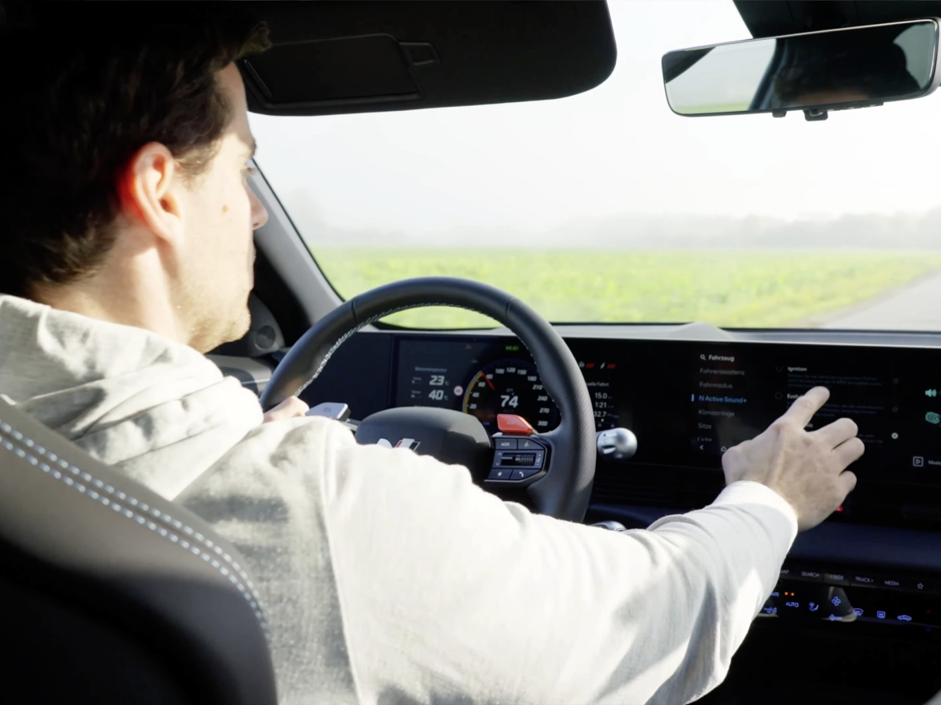 Auch innen beeindrucken die N-Zutaten. Wir haben ein 12,3-Zoll-Digitalcockpit, ein 12,3-Zoll-Infotainment-Display, ein Head-up-Display und dazu Sportschalensitze mit fetten Seitenwangen. Sportlenkrad, schwarzer Dachhimmel, N-Knöpfe – es fühlt sich alles nach ernsthaftem Performance-Auto an.