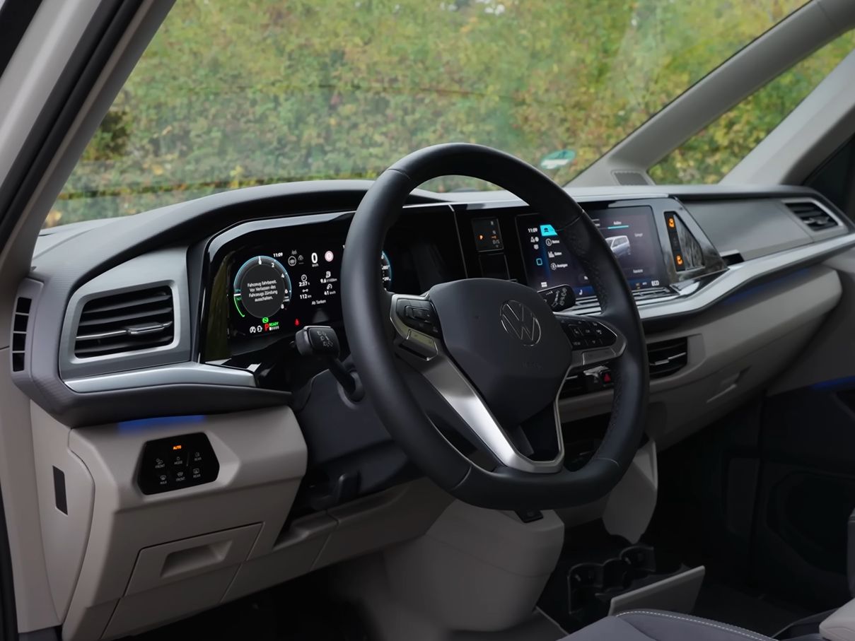Vergiss das Nutzfahrzeug-Gefühl vergangener VW Busse. Der T7 fühlt sich innen an wie ein moderner Golf. Das digitale Cockpit ist frei konfigurierbar, das Smartphone verbindet sich kabellos und die Sprachsteuerung reagiert prompt. Ein einfaches “Mir ist kalt” genügt und die Heizung legt los. Auch gut: die echten Tasten am Lenkrad.
