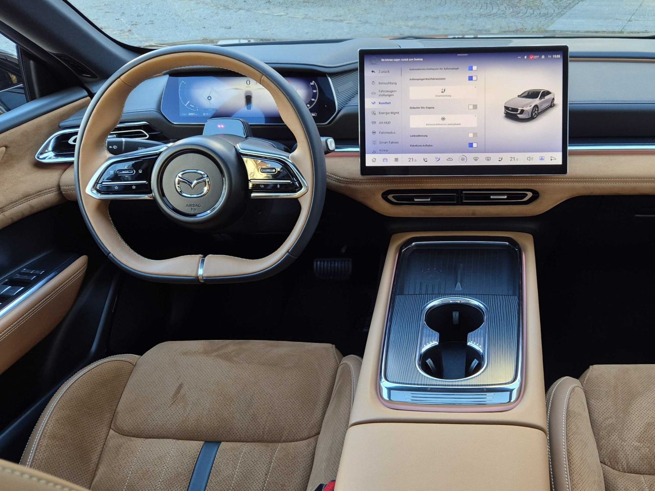Mazda liefert genau das, was man von der Marke erwartet: hochwertige Materialien, saubere Verarbeitung und ein stimmiges Design. Besonders in der Takumi-Plus-Ausstattung wirkt der Innenraum fast schon luxuriös. Nappaleder, Wildleder-Optik und ein klar gestaltetes Cockpit schaffen echtes Wohlfühlambiente. Auch die Basisausstattung ist üppig: Head-up-Display, Sitzklimatisierung, Panorama-Glasdach – alles Serie. Das ist in dieser Klasse keineswegs selbstverständlich.