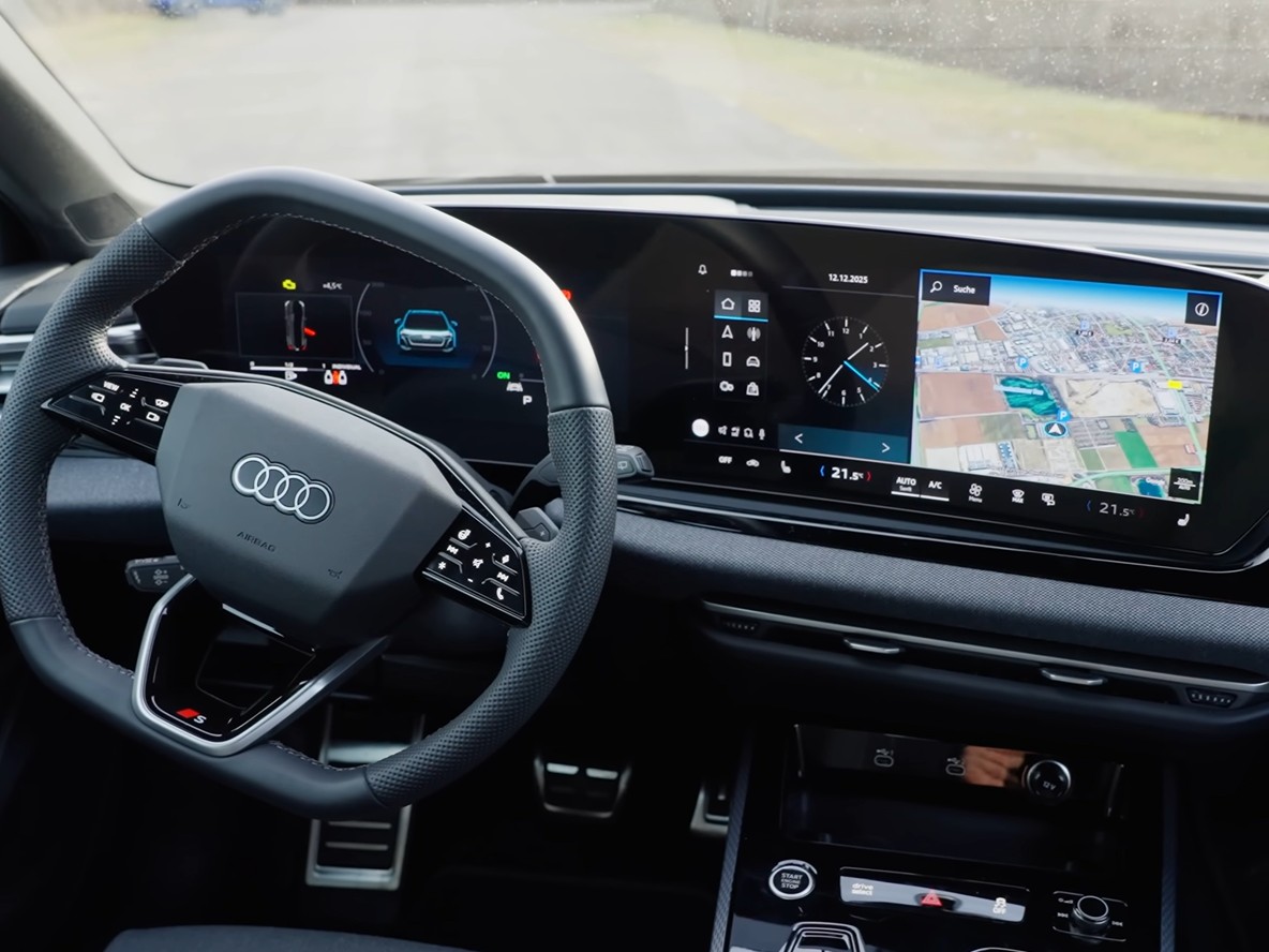 Im Audi sieht’s hochwertig aus, vor allem durch viel Stoff – der kaschiert das Hartplastik ganz gut. Bis du dir das Knie dran stößt. Dann weißt du wieder: Willkommen in der Realität. Ob man ein Beifahrerdisplay braucht, sei dahingestellt. Das Hauptdisplay ist groß, die Klima ist ins Display gewandert (Gewöhnungssache) und die Mittelkonsole präsentiert sich schön clean … nur leider in Glanzlack, was Fingerabdrücke magisch anzieht. Und dann das Lenkrad: echte Knöpfe, aber auch touchsensitiv – du willst leiser machen, streichelst aus Versehen drüber und plötzlich macht das Auto irgendwas.
