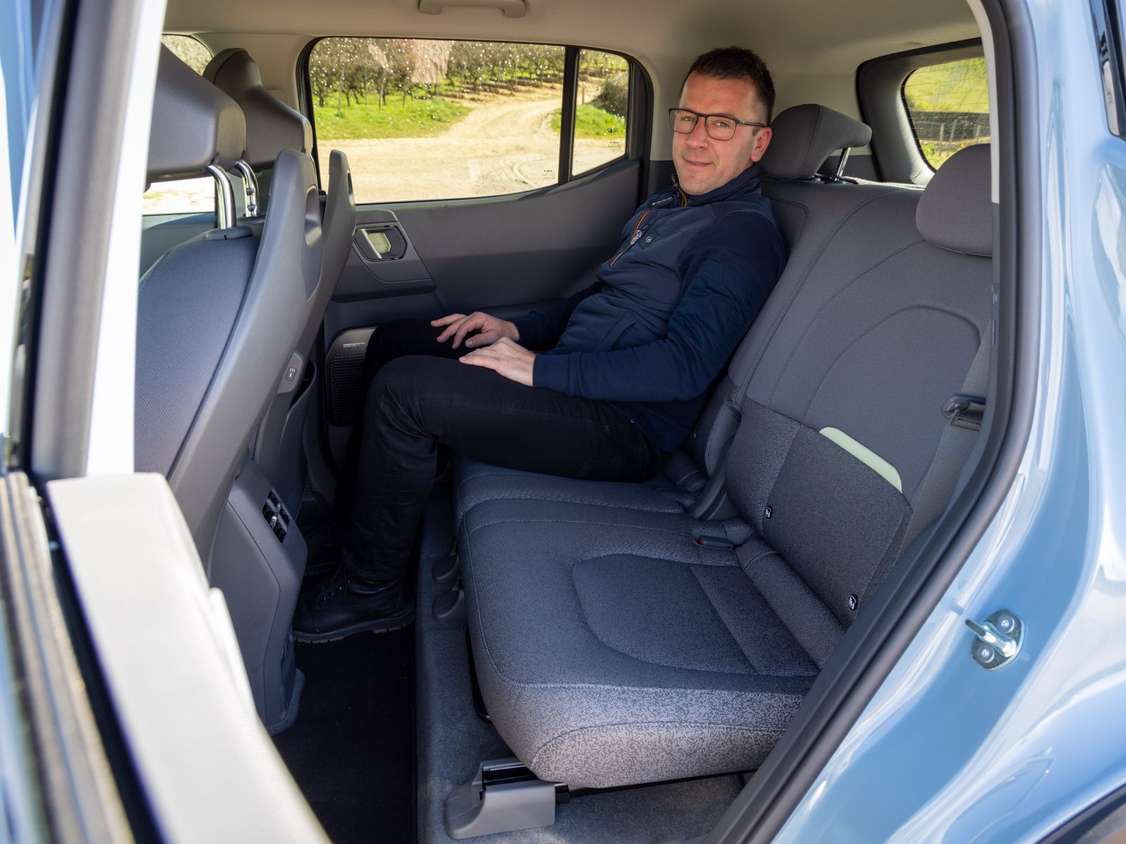 Die Platzverhältnisse für die Insassen sind trotz 4,06 Meter Länge großzügig. Mit einer Breite von 1,80 Metern bietet der EV2 viel Platz für Erwachsene, sowohl vorne als auch hinten. Nur mit den verschiebbaren Rücksitzen auf der vordersten Position wird es eng für die Knie der Fondpassagiere – wobei man die Einstellung auch nur wählt, wenn das maximale Kofferraumvolumen benötigt wird.