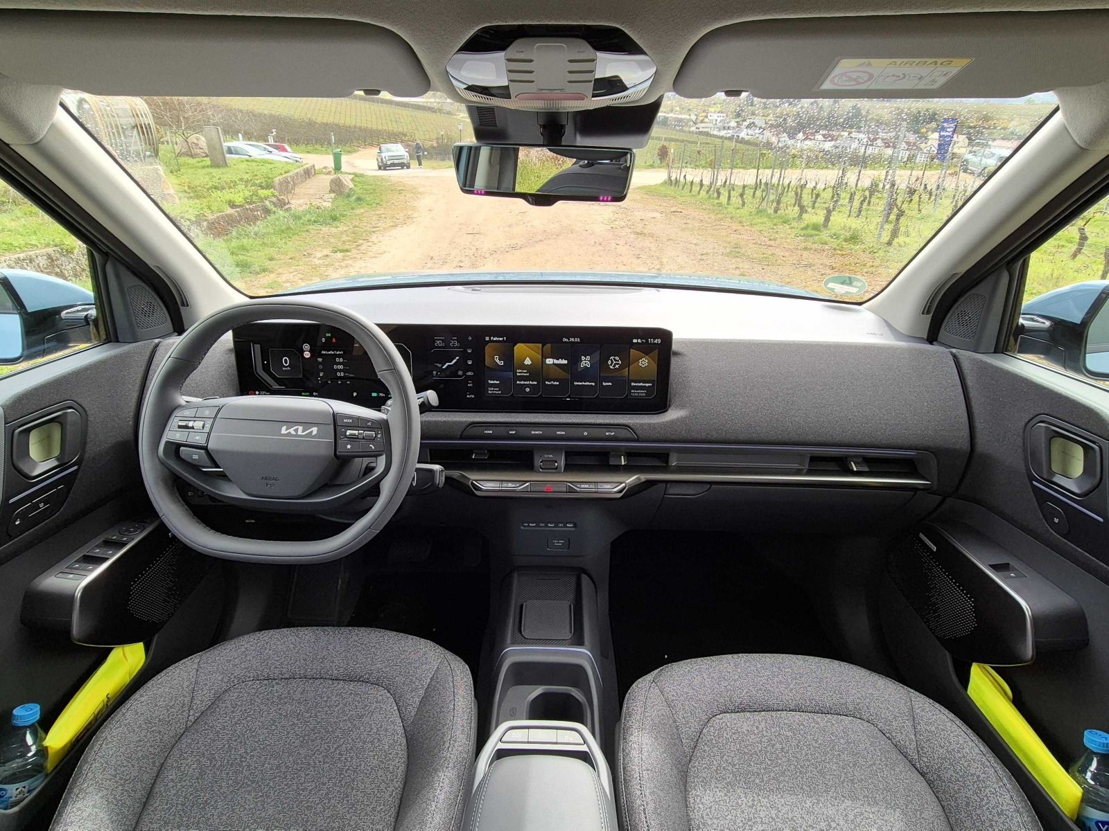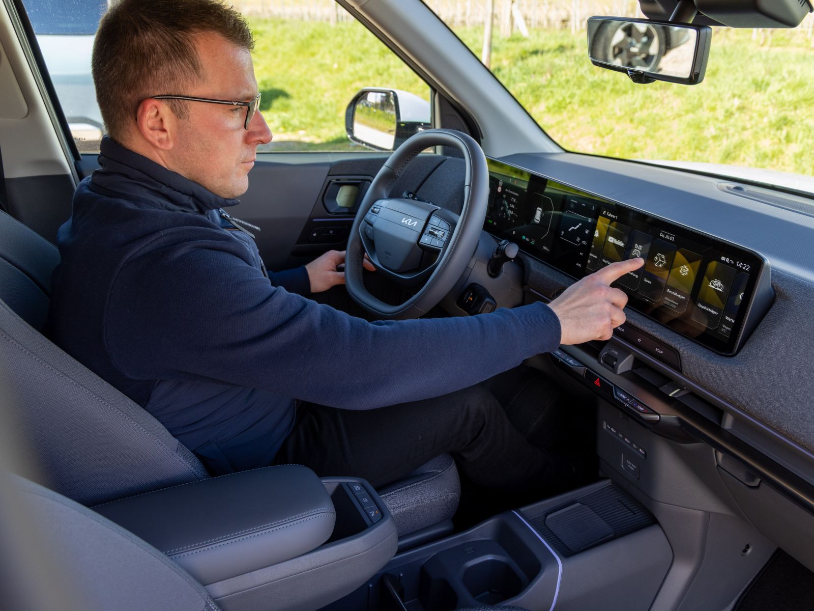 Das Cockpit des KIA EV2 gefällt mit einem großen, optisch ansprechenden Panoramadisplay, das aus drei verschiedenen Einheiten besteht. Ein 12,3-Zoll-Kombiinstrument hinter dem Lenkrad liefert alle wichtigen Fahrdaten, während ein weiterer 12,3-Zoll-Touchscreen für das Infotainment zuständig ist. Dazwischen findet sich ein 5,3-Zoll-Klimadisplay. Die Bedienung der Klima könnte besser sein – das kleine, mittlere Display ist teilweise durch das Lenkrad verdeckt. Dafür lassen sich die wichtigsten Klimafunktionen über Tasten unter den Luftausströmern einstellen.