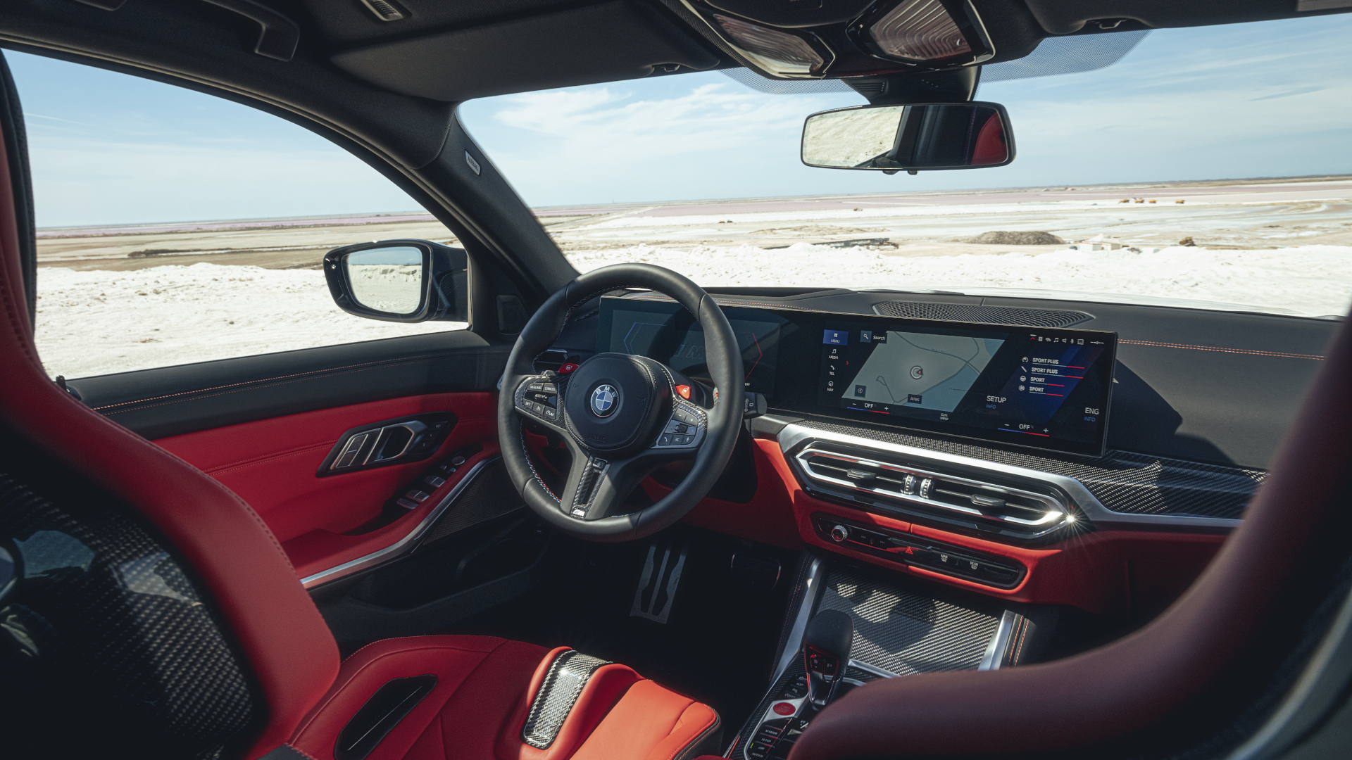 Das hochwertig und sportiv anmutende Cockpit des M3 Touring gehört zum Modernsten, was zurzeit an Technologie in München angeboten wird. BMWs „Curved Display“ spannt sich um den Fahrerplatz im Innenraum. Die Anzeigen sind digital. Unter der durchgehenden Glasfläche sitzen ein 12,3 Zoll großes Instrumentendisplay und ein 14,9 Zoll großer Touchscreen.