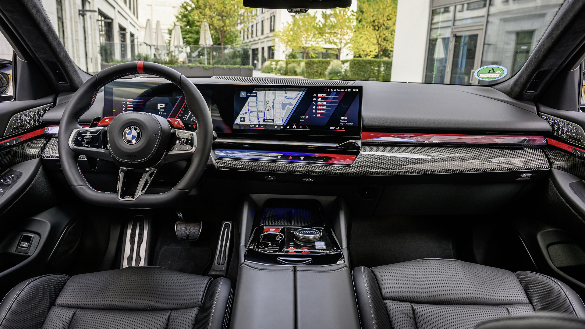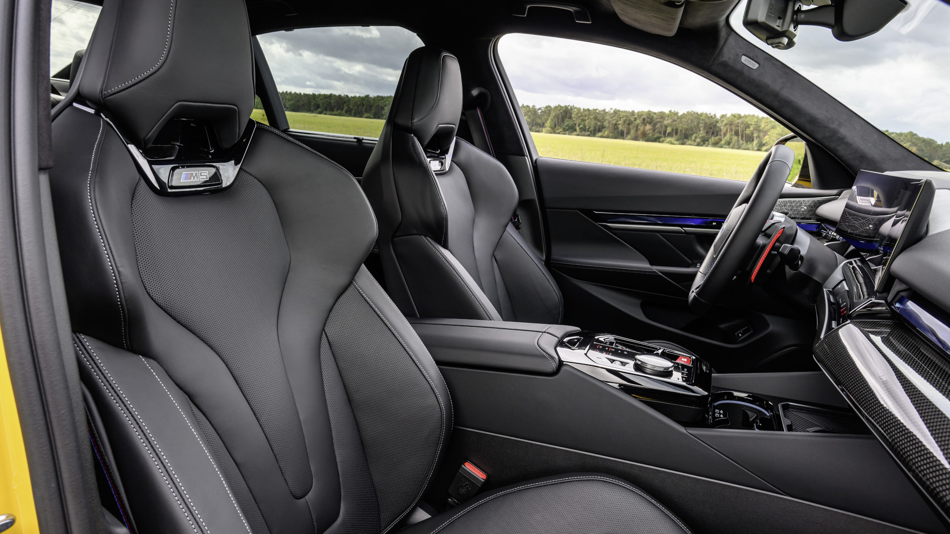 Standardmäßig bestehen die Sitzbezüge beim M5 aus Merino-Leder, das in verschiedenen Farben gewählt werden kann. Die Verkleidungen umfassen Aluminium- oder Carbon-Details, die wahlweise eher die elegante oder eher die sportliche Seite des M5 betonen sollen.