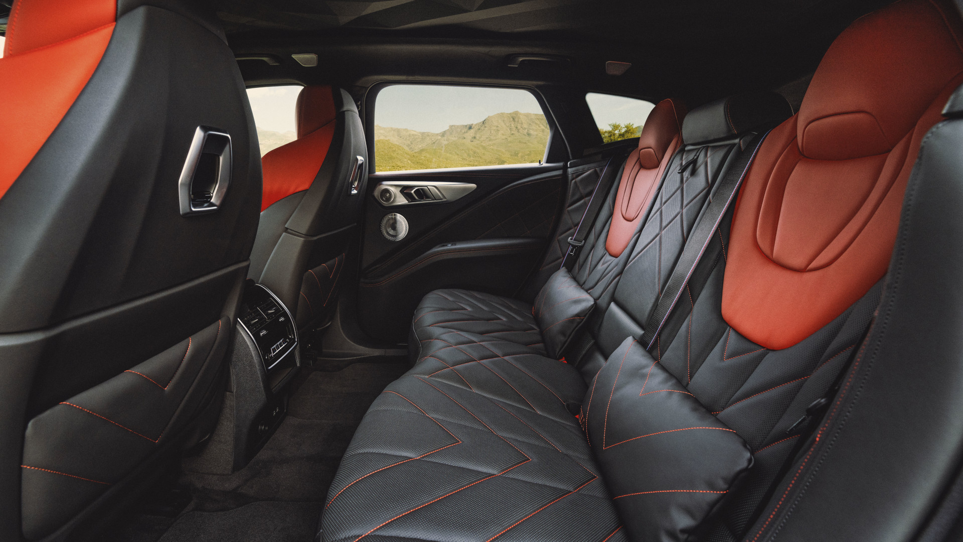 Zwischen den beiden Plätzen im Fond lässt sich eine Armablage ausklappen, in die zwei Becherhalter integriert sind. Durch Ziehen an einer Lasche öffnet sich eine Durchreiche zum Kofferraum, mit der zum Beispiel Ski transportiert werden können. An der Rückseite der Rücksitze befinden sich Anschlüsse für Handy und Tablet, im unteren Bereich noch Fächer, zum Verstauen von Zeitschriften oder anderen Gegenständen. In den Türen im Fond bietet der BMW XM weitere große Fächer, in die Becherhalter integriert sind. Isofix-Vorrichtungen für Kindersitze gibt es an den äußeren Plätzen im Fond.