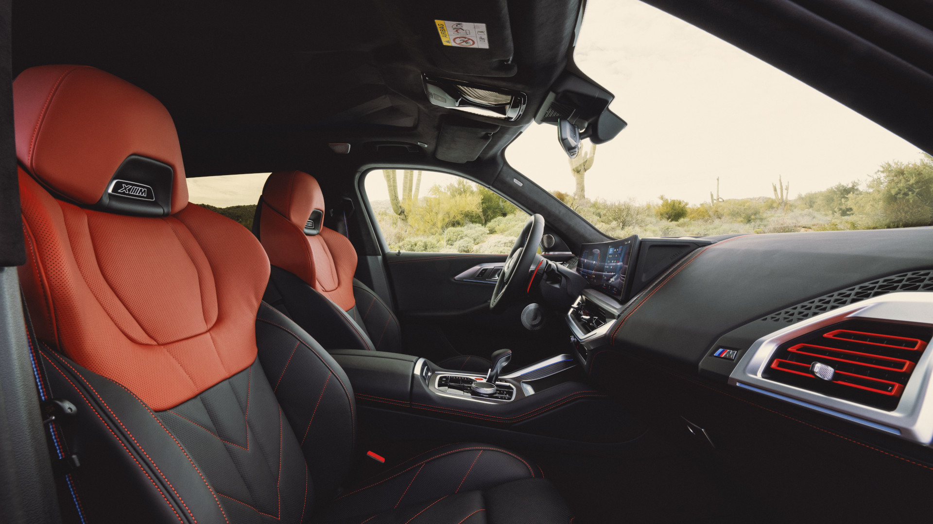 Überhaupt, Leder: Davon gibt es im Innenraum des BMW XM jede Menge. An den Sitzen, den Seitenteilen, dem Mitteltunnel, überall. Das Merino-Leder bietet der Hersteller für das SUV in vier Ausstattungsvarianten an. Standard ist die schwarze Ausführung, weitere Variationen gegen Aufpreis sind rot, blau und silber. Vergessen sind die veganen Ersatzmaterialien, mit denen unter anderem auch BMW versucht, neue Kund:innen zu gewinnen, das Luxus-SUV soll offenbar andere Käufer:innenschichten ansprechen. Verständlich, wer sich den BMW XM zulegt, dürfte wohl wenig an Nachhaltigkeit interessiert sein. Weitere Materialien sind die vielen Chrom- und Carbonapplikationen im Interieur. Die Sportsitze bieten Massagefunktionen, im Heck gibt es zwei zusätzliche Kissen. Das sieht man auch nicht oft bei einem Autohersteller.