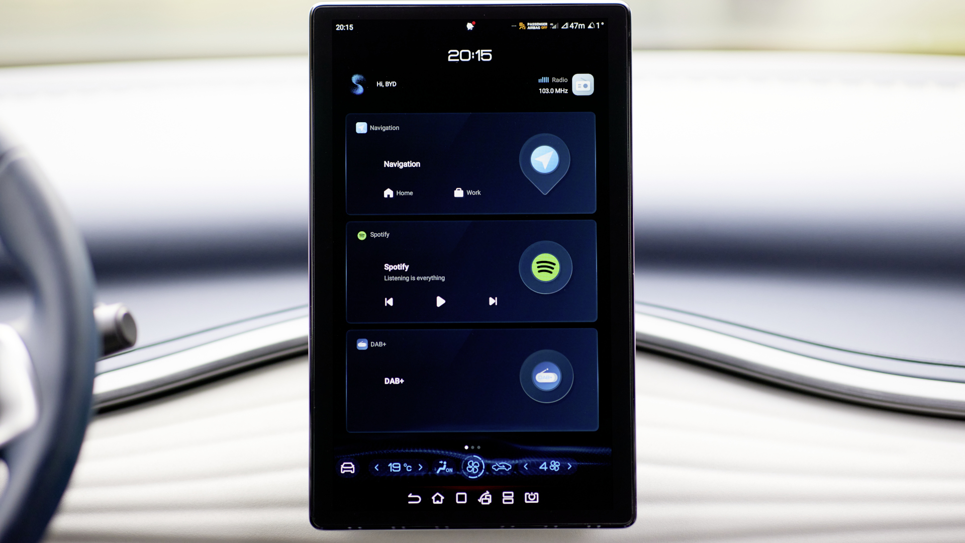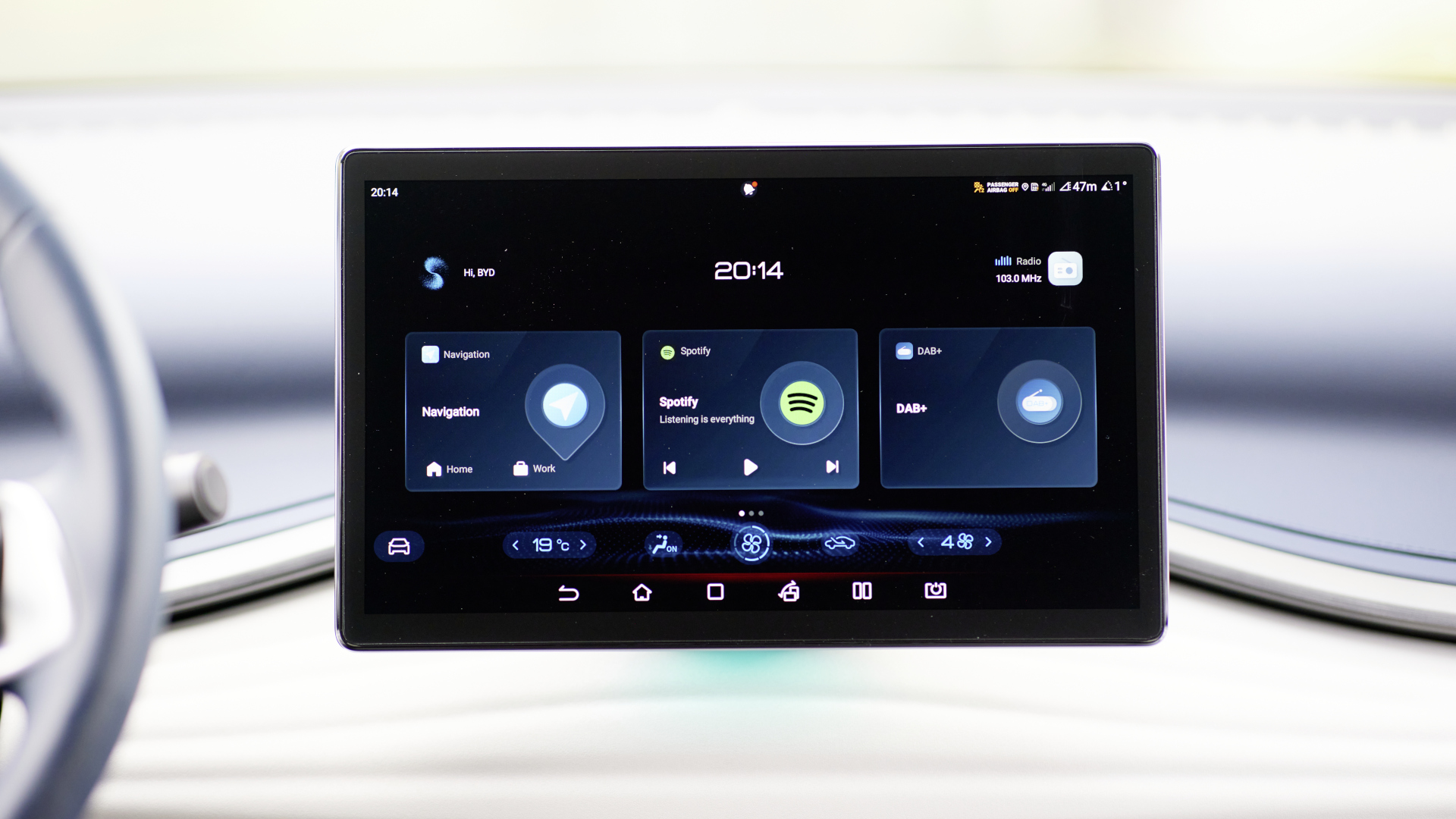 Der große Touchscreen in der Mitte des Armaturenbretts überzeugt. Die Einstiegsversion des Atto 3 hat einen 12,0-Zoll-Bildschirm, aber die höheren Ausstattungslinien werden sogar mit einem riesigen 15,6-Zoll-Display ausgeliefert. Der Bildschirm reagiert schnell und das Smartphone-ähnliche Menü greift auf bekannte Elemente und Darstellungen zurück. Alternativ kannst du Apple CarPlay und Android Auto nutzen, um dein Telefon zu verbinden.