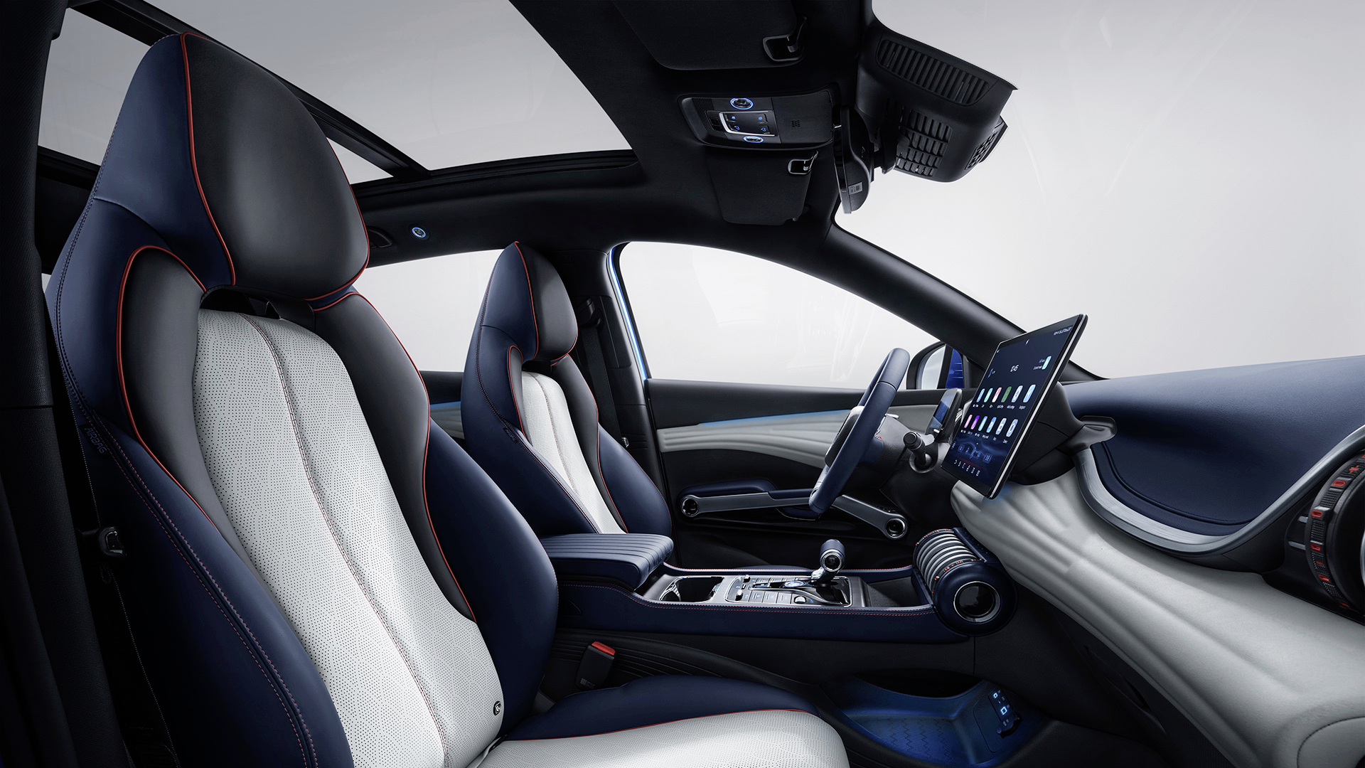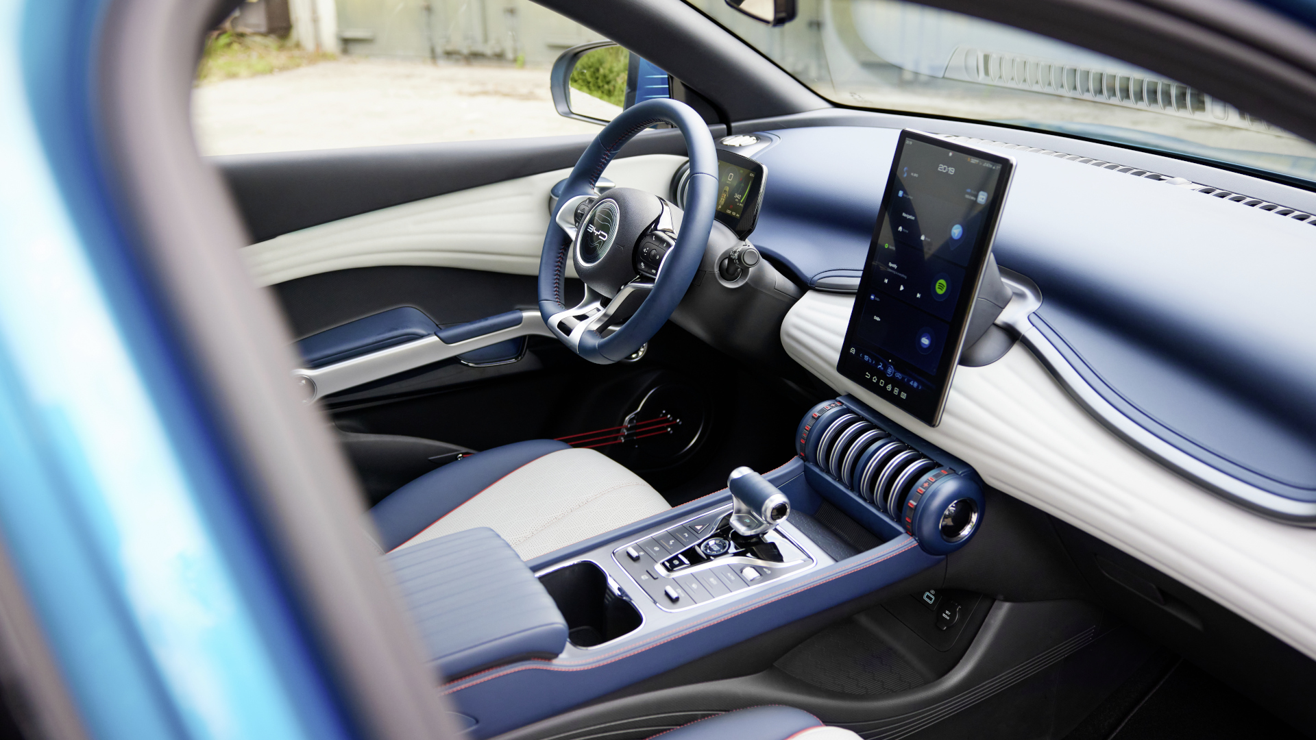 Etwas verspielt hat sich BYD in manchen Details dennoch: Die inneren Türgriffe sind große, flache Hebel, die um die kleinen Stereolautsprecher herum rotieren, als würdest du den Gashebel eines Motorbootes bedienen. In die Lautsprecher sind LED-Leuchten integriert, die im Takt der Musik pulsieren können, damit richtig Partystimmung im Atto 3 aufkommt. Sogar ein optionales Karaoke-System ist erhältlich.