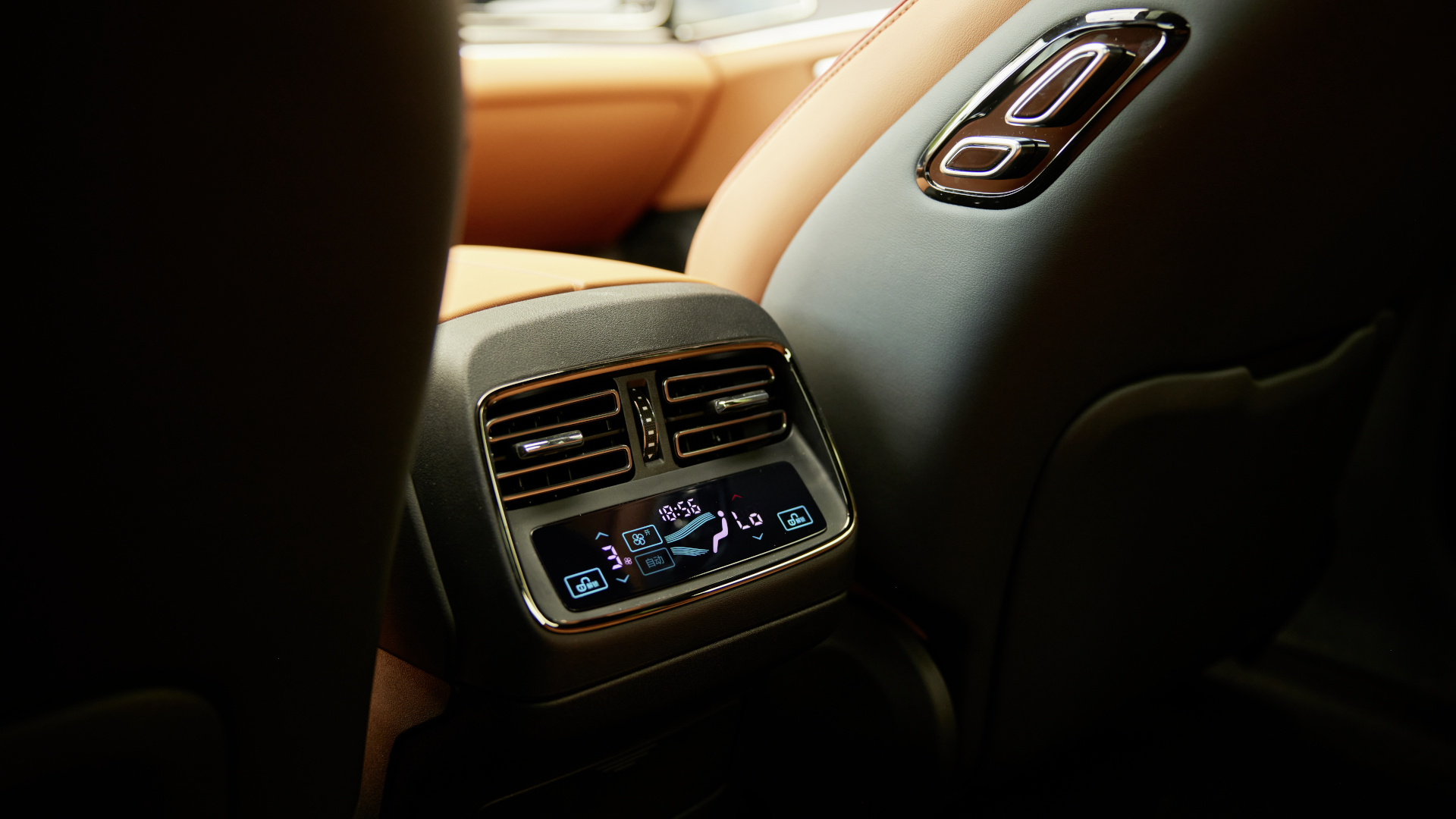 Noch ein weiteres Display ist beim BYD Han zu nennen. Das 7-Zoll-Display befindet sich in der Mittelarmlehne der Rückbank, die zugänglich wird, wenn der nicht benötigte Mittelsitze nach vorn zur Lehne geklappt wird. Dabei klappt auch die Kopfstütze mit um, wodurch sich eine großzügige Armlehne mit reichlich Komfort ergibt.
