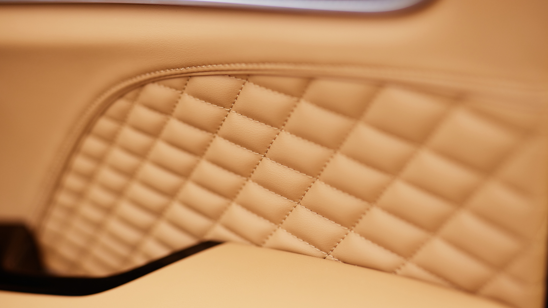 Auf der Rückbank sitzen Mitfahrende vergleichsweise weit zurückgelehnt. Der seitliche Blick wird von der dunklen C-Säule eingeschränkt. Durch die Batterie im Boden des Fahrzeuges ist der Boden auch im Innenraum entsprechend höher, was einen spitzeren Kniewinkel zur Folge hat. Etwas dunkel wird es im Fond der Limousine nicht nur aufgrund des entsprechend gefärbten Dachhimmels, sondern auch weil das Panoramadach noch vor der Rückbank endet und kein Licht spendet.