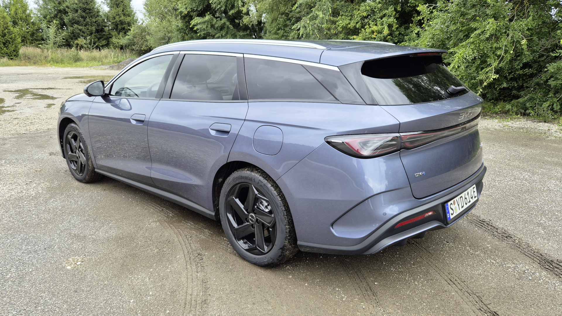 Die Fakten sind also vielversprechend, doch wie fühlt der BYD-Kombi an? Kurz und knapp: gut. Der Innenraum empfängt dich mit abwechslungsreichen Materialien, optisch wie haptisch. Nicht Premium, aber solide. Hinten sorgt der Radstand von 2,79 Metern für ordentlich Beinfreiheit und der Kofferraum schluckt vorzeigbare 500 Liter. Nur die sehr breite Mittelkonsole sorgt mit ihrem schwergängigen Klappe und den optimierungsbedürftigen Getränkehaltern für Minuspunkte.