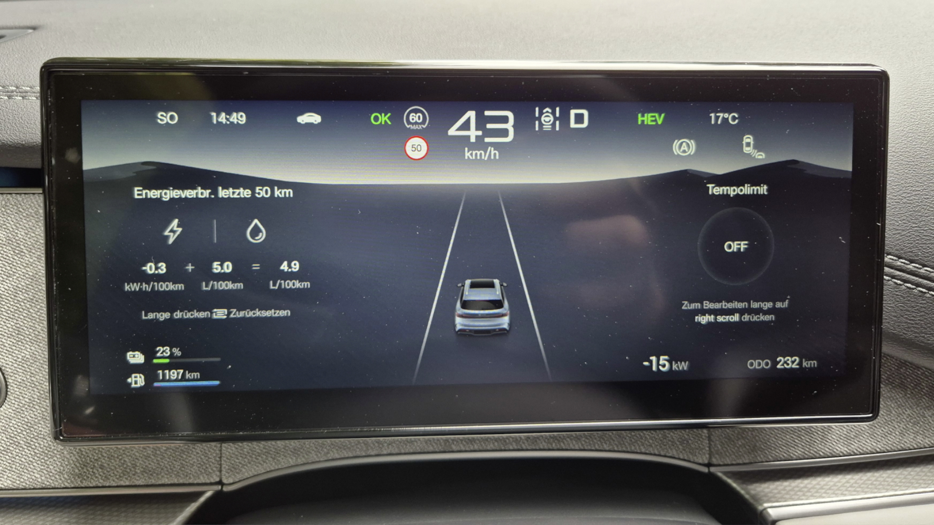 Zurück zum Positiven: Das Lenkrad liegt gut in der Hand und der Seal 6 DM-i Touring lässt sich dank des niedrigen Schwerpunkts (Batterie im Boden) recht dynamisch durch die Kurven bewegen, auch wenn er vor allem zum Spritsparen gedacht ist. Letzteres gelingt ihm bei entsprechender Fahrweise auch.