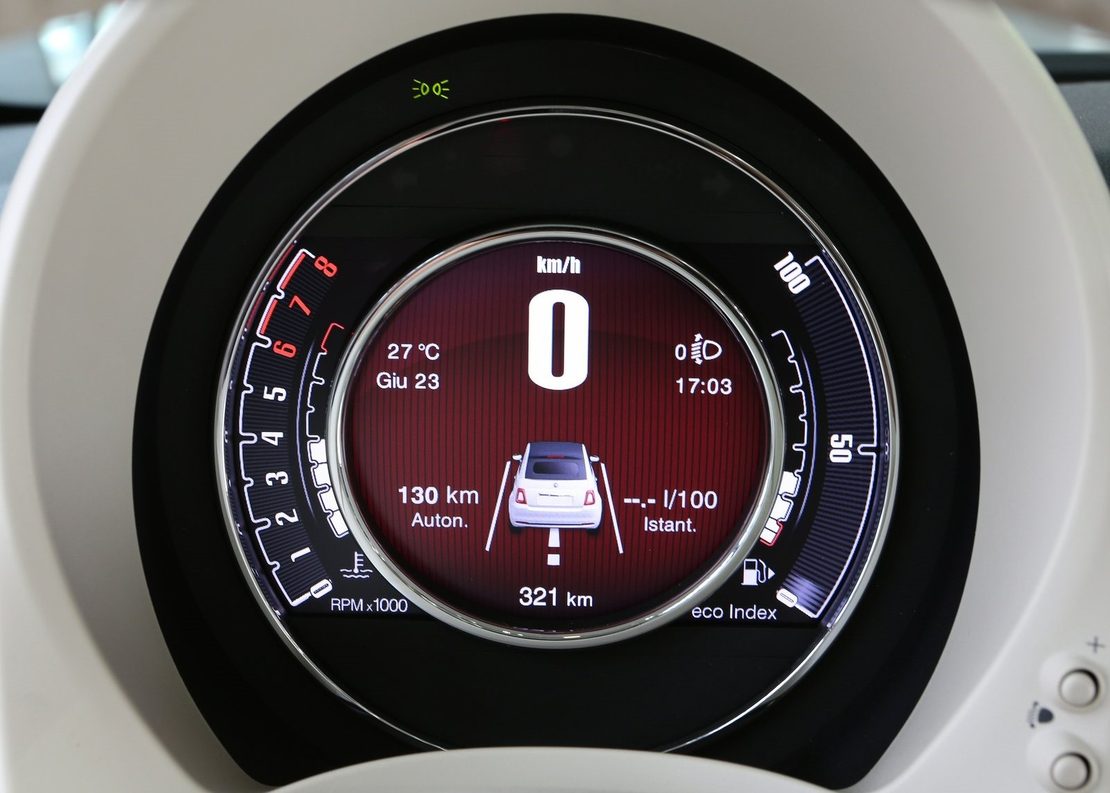 Die Schaltanzeige mahnt einen zum hoch schalten, was Benzin spart. Und sogar „segeln“, bei dem sich der Motor kurzfristig in Fahrt zum Sparen ganz abschaltet, ist im Fiat 500 Hybrid möglich, wenn man aktiv eingreift.