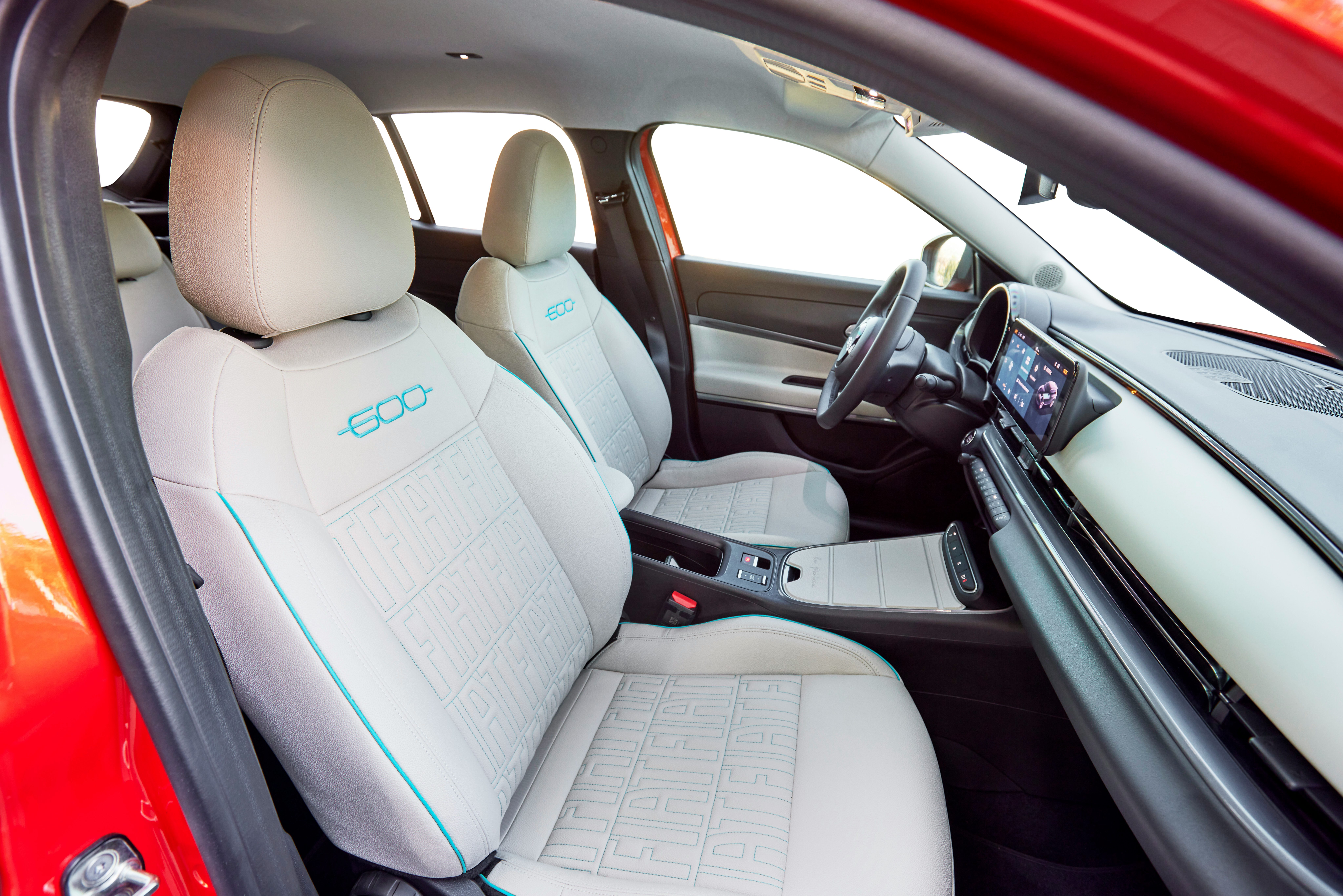 Der Blick in den Innenraum offenbart perfekt, für was Fiat stehen möchte: La Dolce Vita. Hier wird man verwöhnt, bekommt tollen Komfort und das alles in lebensfroher Atmosphäre mit jeder Menge Details. Der oder die Fahrer:in kann sich über elektrisch verstellbare Sitze und Massagefunktion freuen, was vor allem bei langen Fahrten sehr angenehm sein kann. Die elfenbeinfarbenen Kunstledersitze, die mit Fiat-Monogrammen bestickt sind, sind mit türkisfarbenen Akzenten versehen und machen das italienische Lebensgefühl nochmal deutlich.