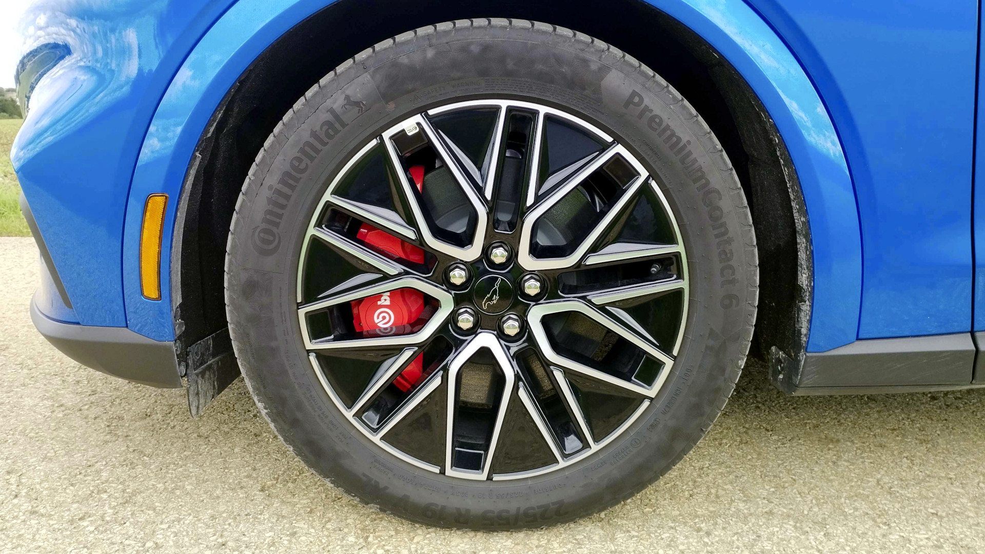 Die Motorversionen mit 268 bis 375 PS Leistung erhalten das straff abgestimmte, aber ausgewogene Standardfahrwerk mit Stahlfedern. Im Topmodell Mach-E GT mit 487 PS, das man auch an den roten Bremssätteln der Sportbremsanlage vom italienischen Bremsenprofi Brembo erkennt, kommen dagegen die variablen, vom Mustang Benziner bekannten variablen Magnetic-Ride-Dämpfer zum Einsatz.