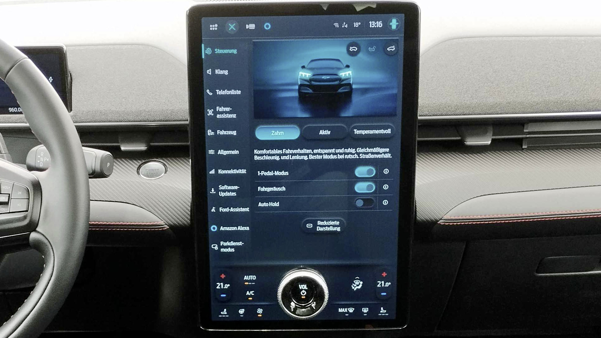 Es pocht und grollt nicht mehr im langen Motorraum, aber drei Fahrmodi machen Stimmung. Im “Zahm”-Modus geht es flüsternd-leise voran. Der “Aktiv”-Modus soll mitreißen. Im “Temperamentvoll”-Modus (ungezähmt) lenkt der Mach-E direkt ein und beißt bissig an.