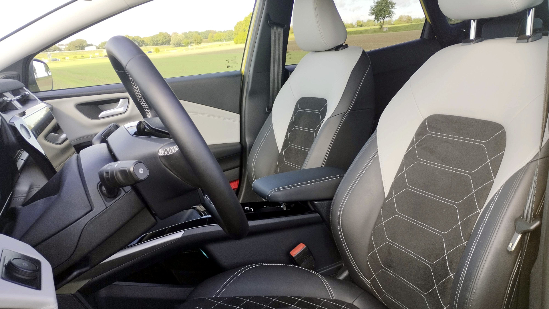 Vorn ist das Platzangebot überzeugend: Bis etwa 1,90 Meter sitzt man bequem, auch mit optionalem Panoramadach. Der Schulterraum von 1,35 Metern vorne sorgt für angenehmen Abstand zwischen Fahrer:in und Beifahrer:in.