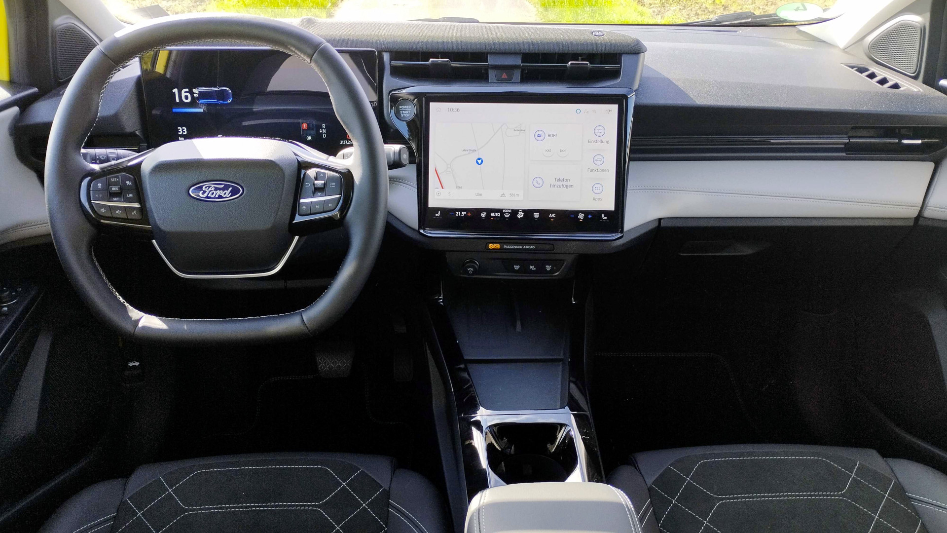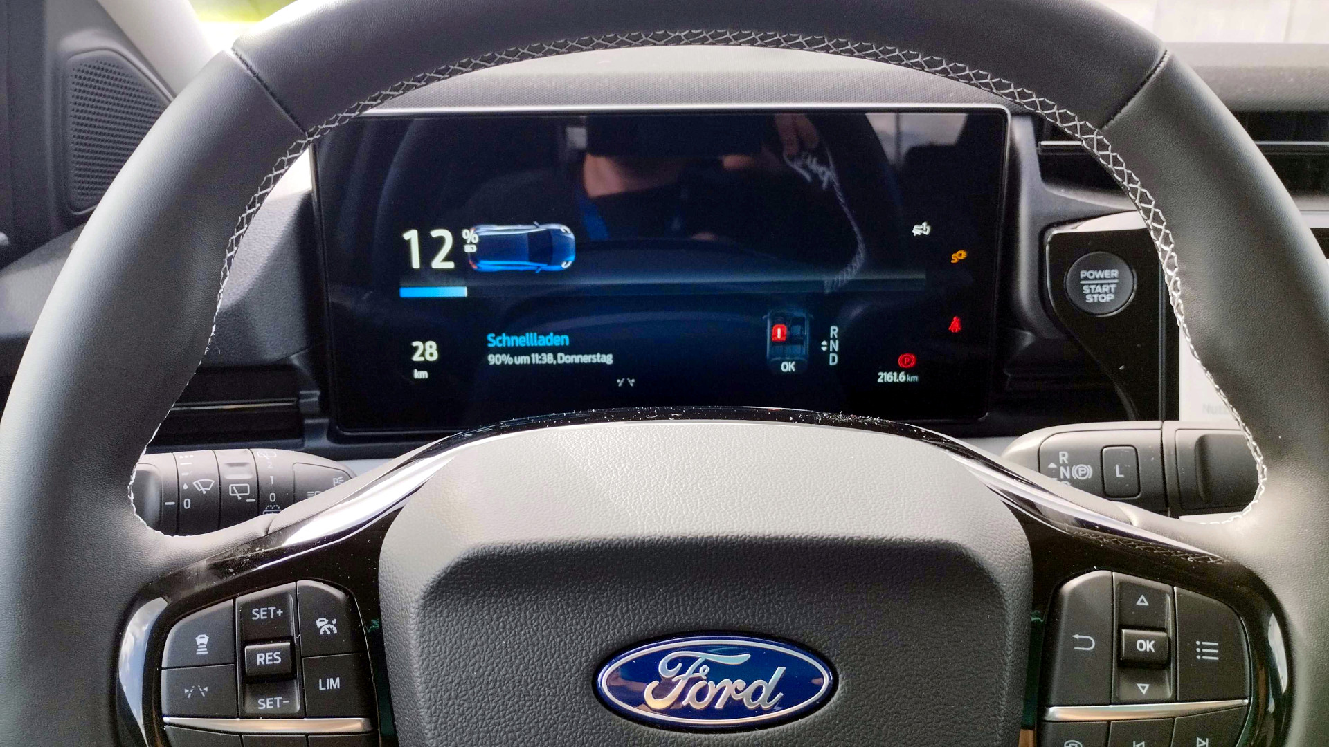 Das Cockpit präsentiert sich komplett digital und auf der Höhe der Zeit. Zwei große Bildschirme dominieren den Blick: Ein 12,8 Zoll großes Instrumentendisplay hinter dem Lenkrad und ein 12 Zoll großer Touchscreen in der Mitte. Das Infotainmentsystem basiert auf Ford Sync 4, läuft flüssig und unterstützt kabelloses Apple CarPlay und Android Auto.