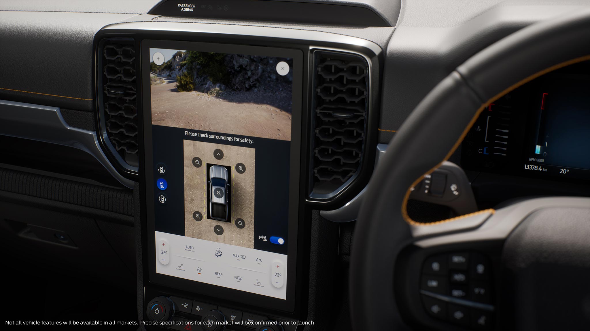 Der Fortschritt zeigt sich sogleich nach dem Einstieg. Im Cockpit ist der Ranger in der Moderne angekommen. Das Infotainment der aktuellen Ford SYNC-Generation wird weitgehend über den 10 oder 12 Zoll großen und hochkant stehenden Touchscreen gesteuert. Die Sicherheitsausstattung wurde mit dem Modellwechsel auf den aktuellen Stand gebracht und reicht vom Querverkehrswarner bis zum Einparkassistenten. Die neue 360-Grad-Kamera bietet in unübersichtlichen Geländepassagen wie die neue 360-Grad-Umfeldbeleuchtung bei Dunkelheit echte Vorteile.