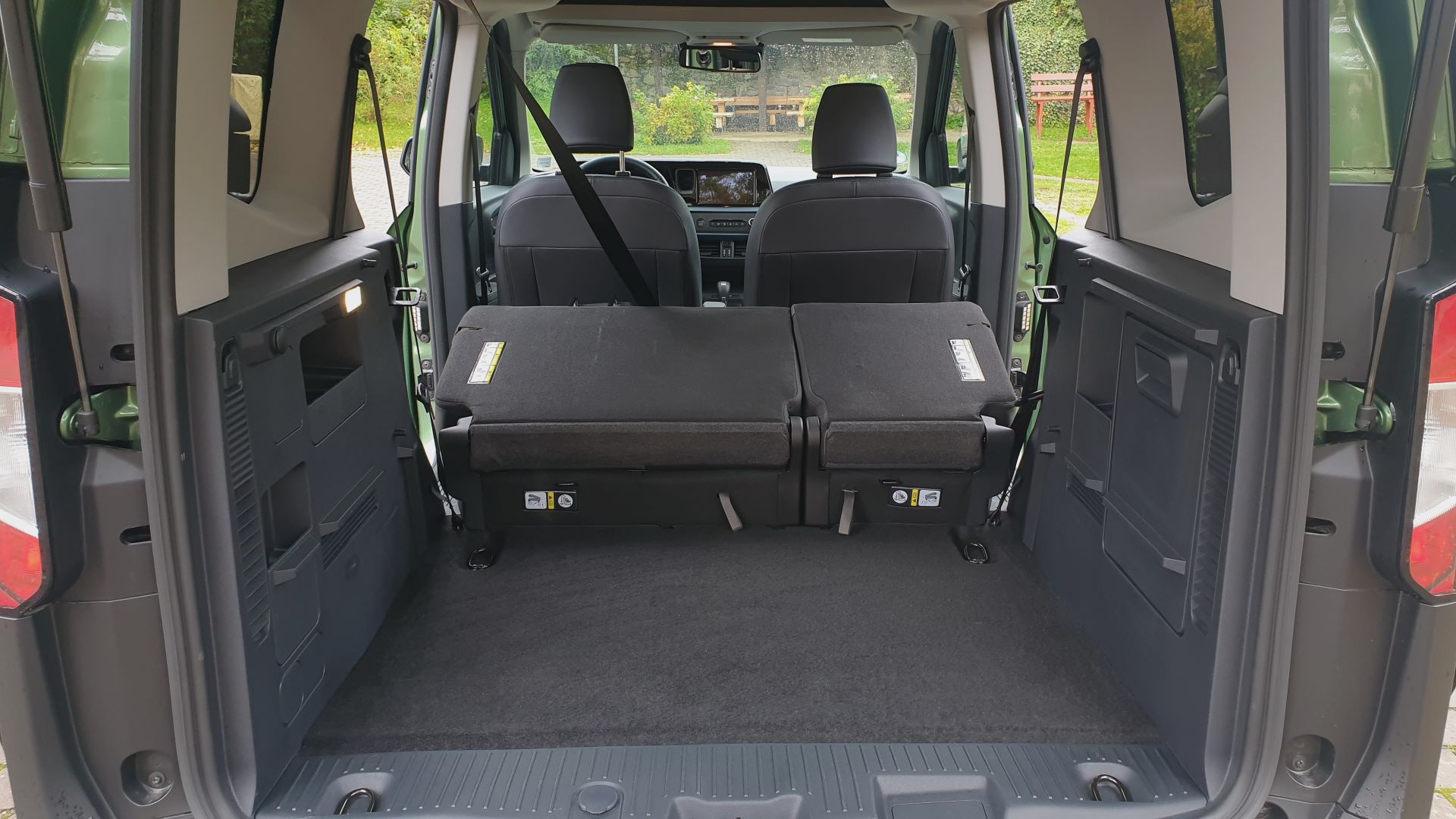 Auch zahlreiche Ablagemöglichkeiten haben wir entdeckt. Nicht nur dort, wo man sie erwarten würde, also in der Mittelkonsole oder in den Türen. Nein, auch oberhalb der Vordersitze ist auf ganzer Breite ein Ablagefach zu finden - hier spielt die Karosserieform Hochdachkombi ihre Vorteile aus. Und auch auf der Beifahrer:innentseite findet sich im Armaturenbrett ein zusätzliches Staufach, wenn auch nur ein kleines. Öffnet man den Kofferraum, entdeckt man auch dort an den Seiten links und rechts Extra-Stauräume.