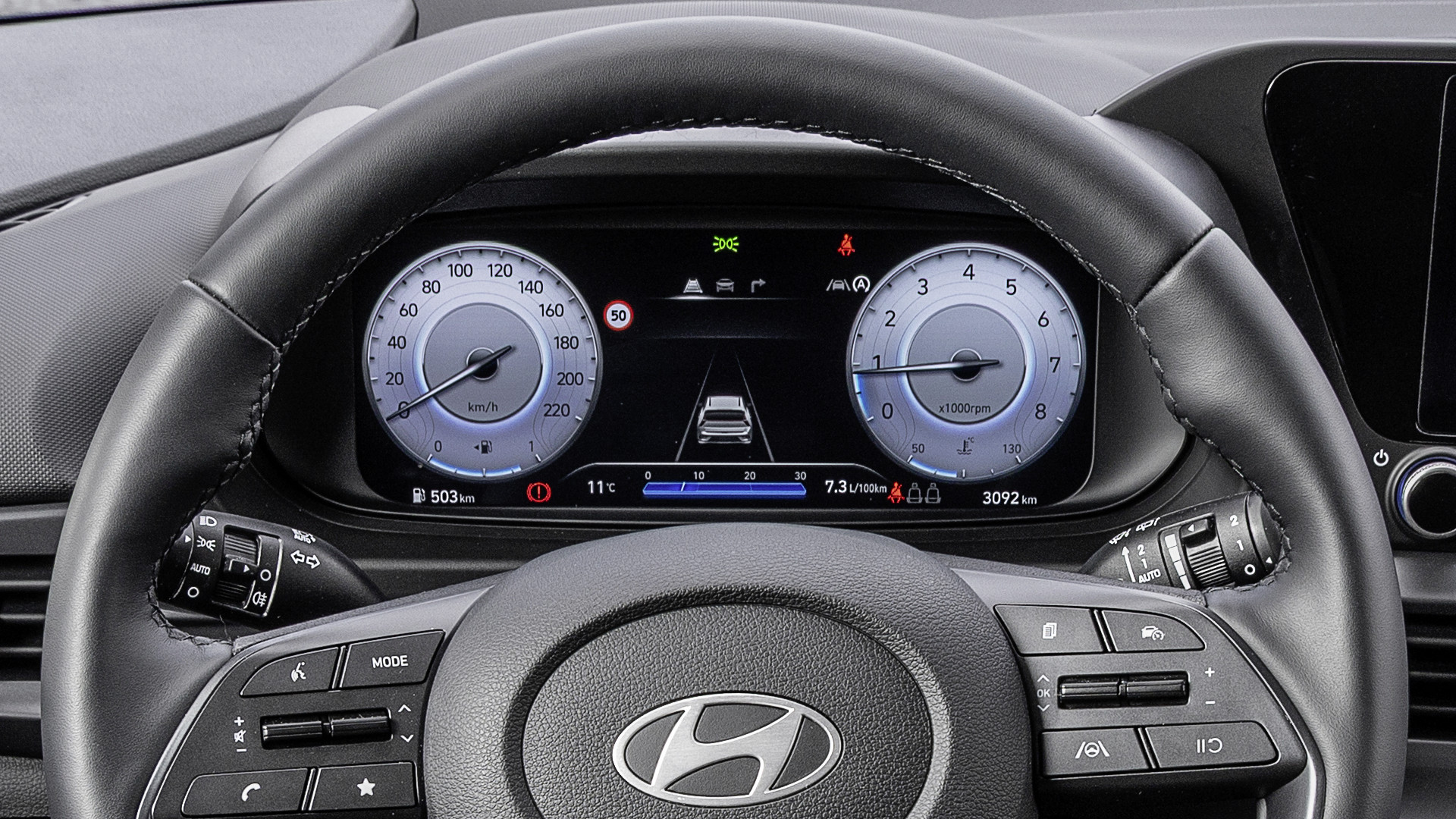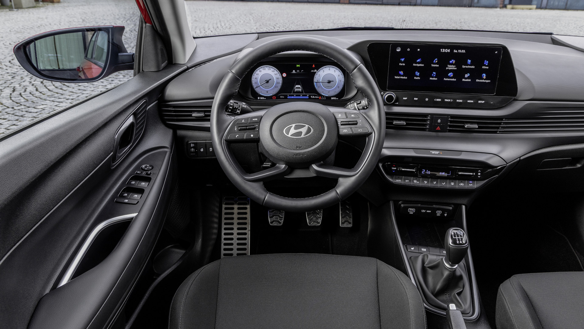 Hinter dem Lenkrad fallen die Unterschiede zum i20-Cockpit gering aus. Mit den digital anzeigenden Instrumenten zählt der Bayon genauso zu den klaren Typen wie bei der Bedienung. Die Direktwahlschalter unterhalb des Touchscreens und der Drehschalter der Heizung geben keine Bedienrätsel auf.