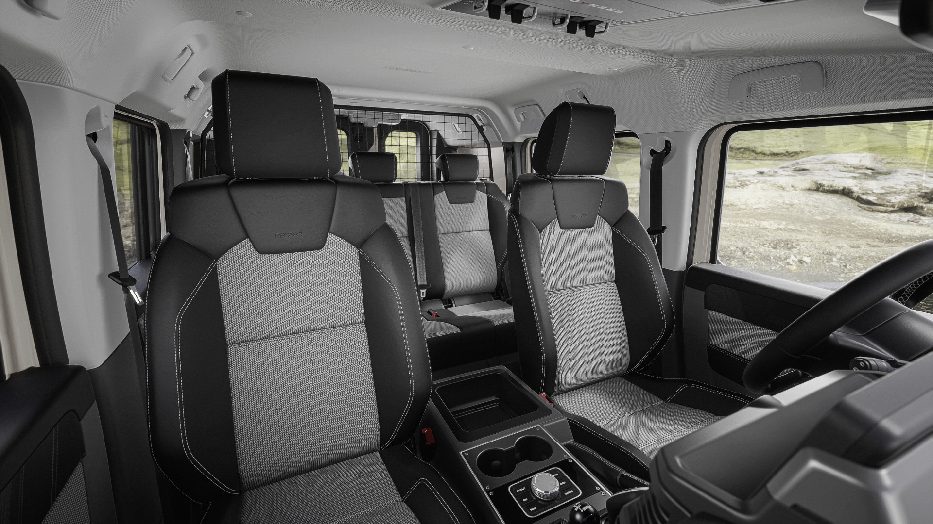 Lederpolster und Teppiche stehen für all diejenigen im Angebot, die vorhaben, keinen Schmutz oder Sand ins Fahrzeug zu tragen. Das Cockpit und die Innenausstattung muten nicht spartanisch wie in der letzten Generation des Land Rover Defender an. Das Interieur wirkt hochwertig, auch wenn Zweckmäßigkeit ganz klar dominiert.