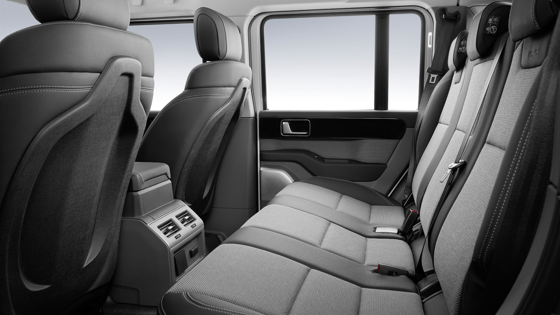 Über Kopffreiheit muss man sich in einem hoch bauenden Geländewagen wenig Sorgen machen. Der Kopfraum über den Vordersitzen misst 1.001 Millimeter. Im Fond ist’s sogar noch ein Millimeter mehr. Bei der Beinfreiheit sieht es auf der Sitzbank anders aus. Steht vorne ein Meter Beinraum zur Verfügung, sind es hinten noch rund 77 Zentimeter. Dies ist nicht viel, aber es genügt. Natürlich auch Kindern, an die im Grenadier mit ISOFIX-Sitzbefestigungen gedacht wurde.