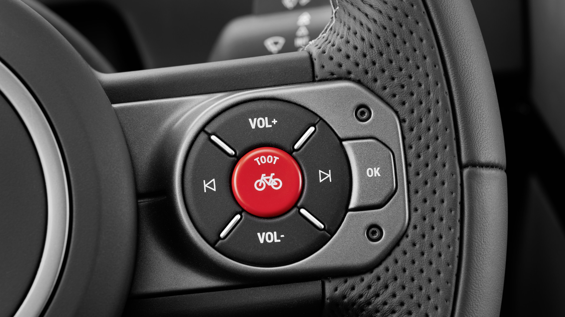 Stattdessen gibt es zwei Hupen: Eine etwas leisere mit einem Knopf am Lenkrad und einem Fahrrad-Symbol darauf, um lästige Radfahrende weg zu hupen und eine lautere, klassisch bedient über Druck auf den zentralen Teil des Lenkrads, um Kleinwagen aus dem Weg zu schaffen.