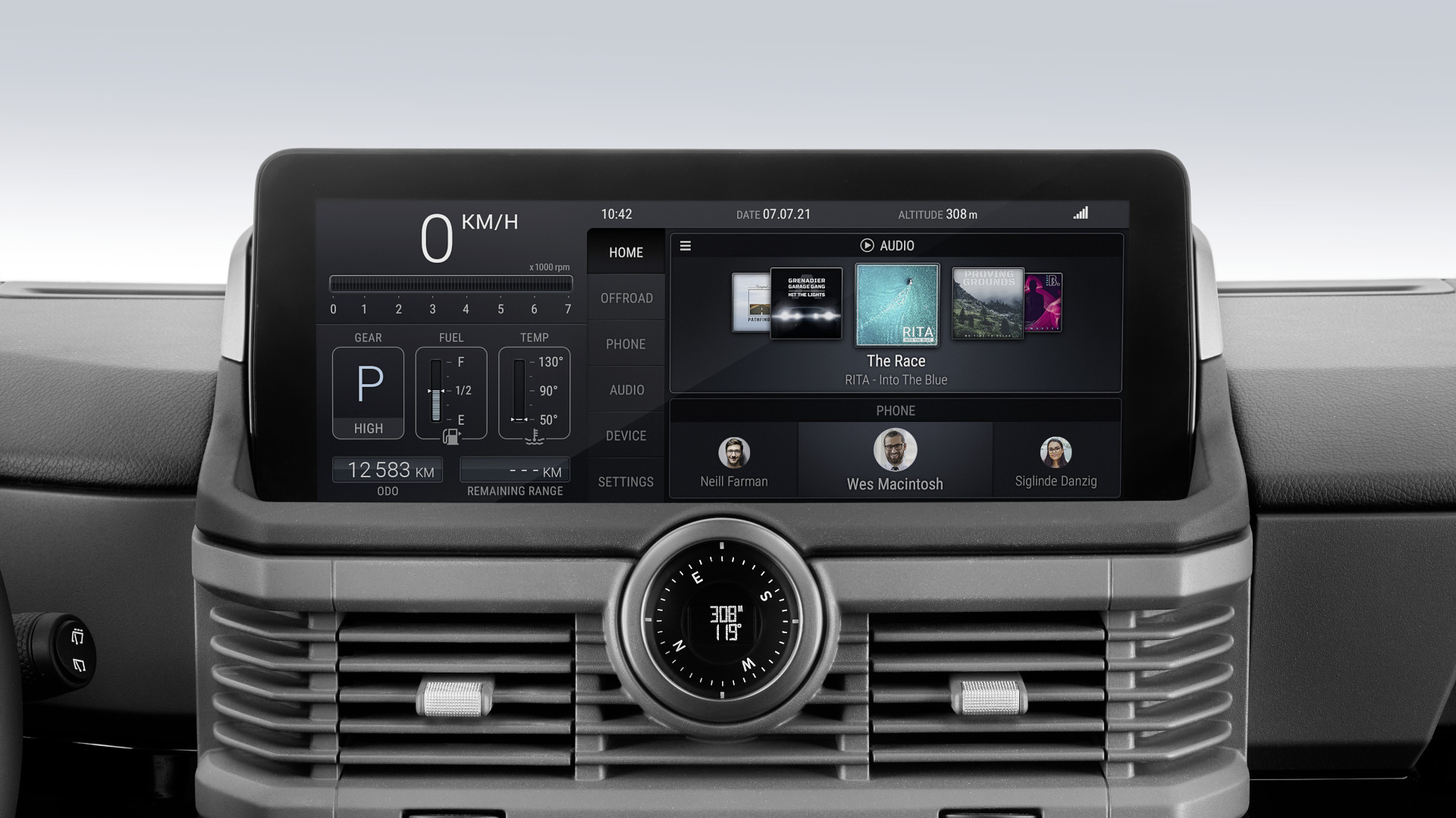 Die Bluetooth-Freisprechvorrichtung zählt im Grenadier genauso zur Serienausstattung wie die zwei USB-Anschlüsse vorn und die 12-V-Buchsen vorn und hinten. Die Ausstattung ist bereits im Basismodell mit der Klimaautomatik, den Recaro Sitzen und dem Tempomat ordentlich. In den Editionsmodellen Trialmaster und Fieldmaster wird noch mehr geboten.