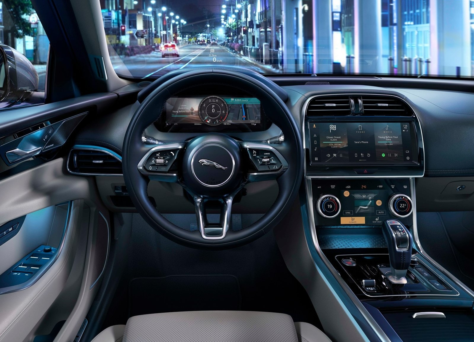 In der mittleren Ausstattungslinie besitzt der Jaguar XE das 12,3-Zoll-Digitalcockpit, das Online Pack und ein Navigationssystem. Elektrisch einklapp- und beheizbare Außenspiegel mit Abblendautomatik und Umfeldbeleuchtung sind genauso an Bord wie mehr Sicherheit mit dem 360-Grad-Rundumsichtsystem, der Verkehrszeichenerkennung mit adaptivem Geschwindigkeitsbegrenzer, dem Parkassistenten und mit dem Kollisionswarnsystem beim Rückwärtsfahren.