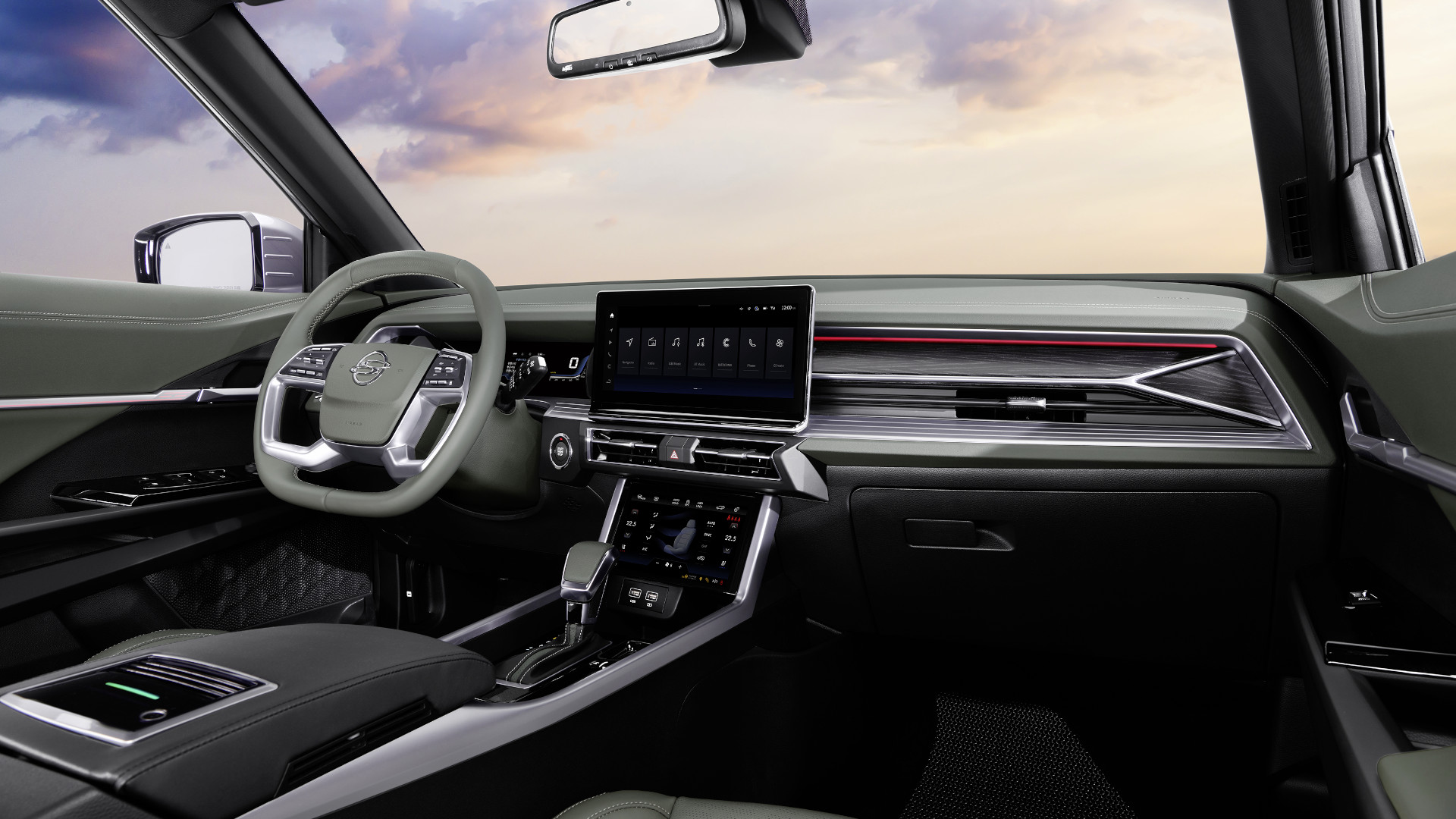 Exterieur und Interieur stehen im Kontrast. Das Äußere mutet kernig an. Das Cockpit und der Innenraum präsentieren sich dagegen elegant und schnörkellos. Die Anzeigetafel verläuft in einem durchgehenden Panel hin zur Mitte. Sie setzt sich aus zwei Digitaldisplays zusammen.