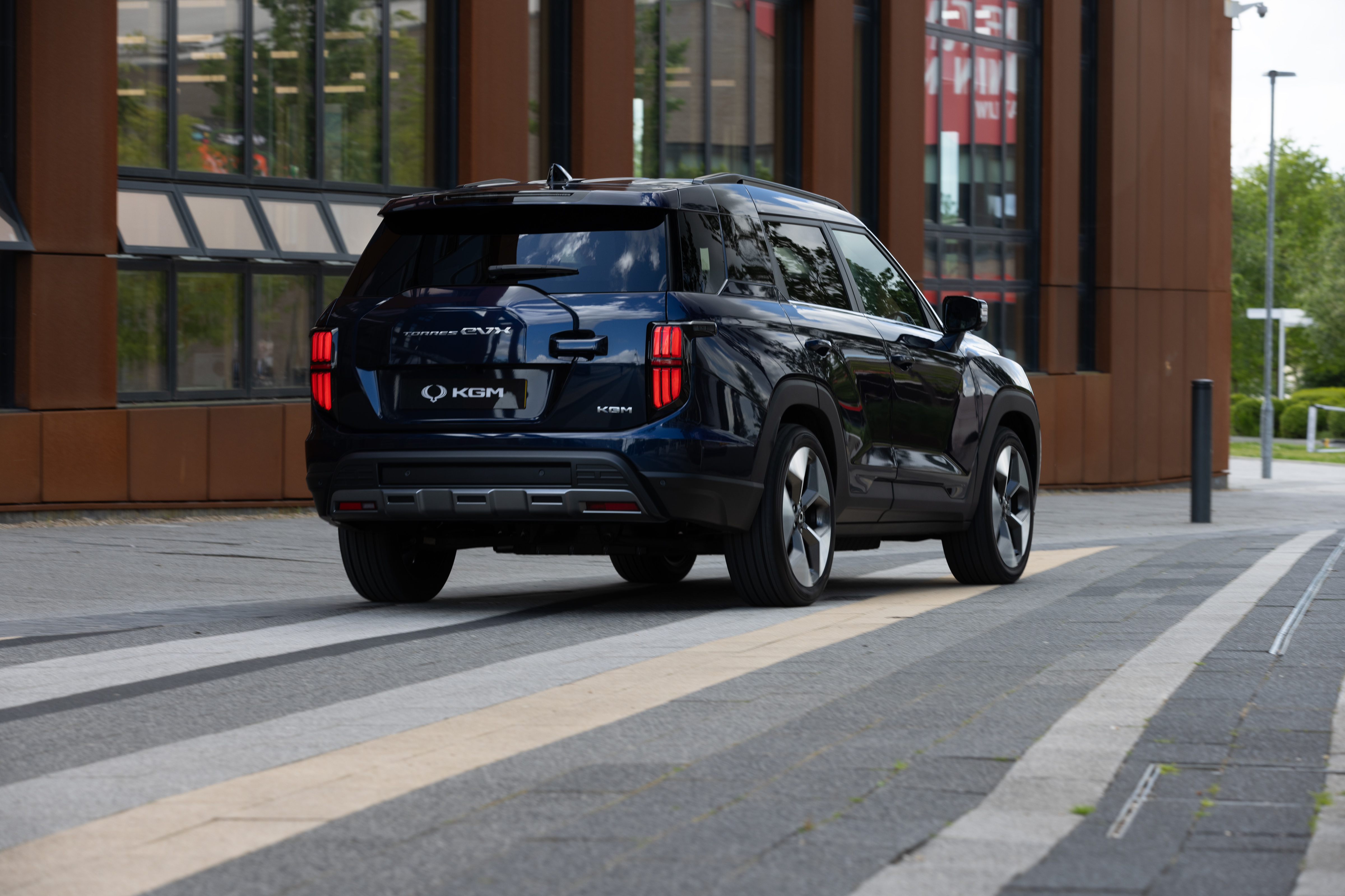 Mit einer Länge von 4,72 Meter befindet sich der KGM Torres EVX an der Grenze zwischen Kompakt- und Mittelklasse. Die Breite des SUVs beträgt 1,64 Meter, die Höhe 1,73 Meter. Mit diesen Maßen ist der EVX nicht so sperrig, wie er aussieht. Auffälligstes Detail am Heck ist die angedeutete Abdeckung für einen Ersatzreifen. Dies zitiert klassische Offroader und ist ein typisches Merkmal der KGM-Fahrzeuge; mehr als ein Designelement ist es jedoch nicht.